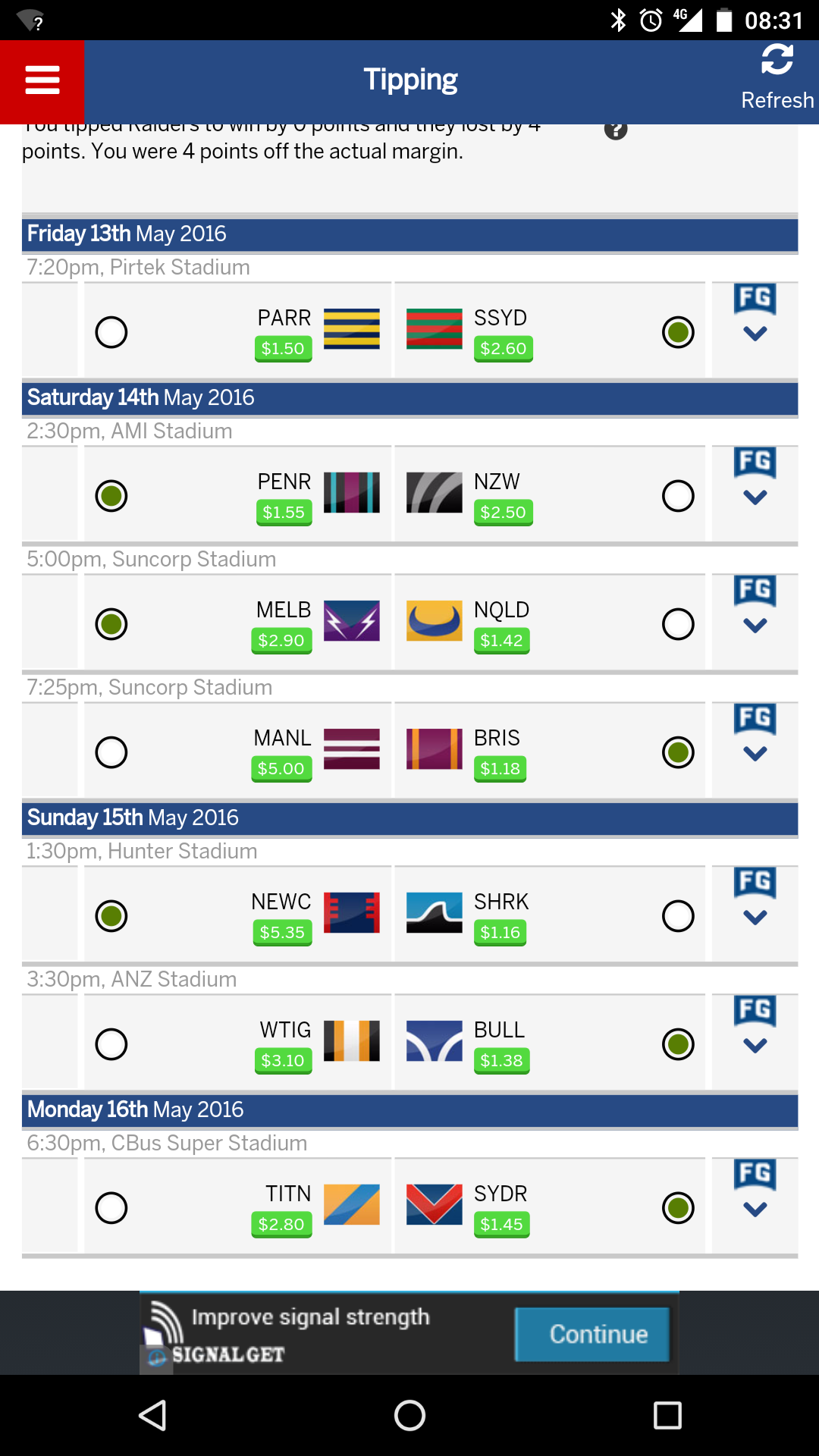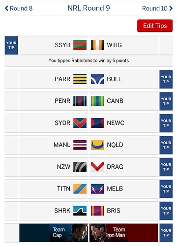 All tips for ROUND 10 must be in by 7:30pm Thursday, 12th May AEDT.