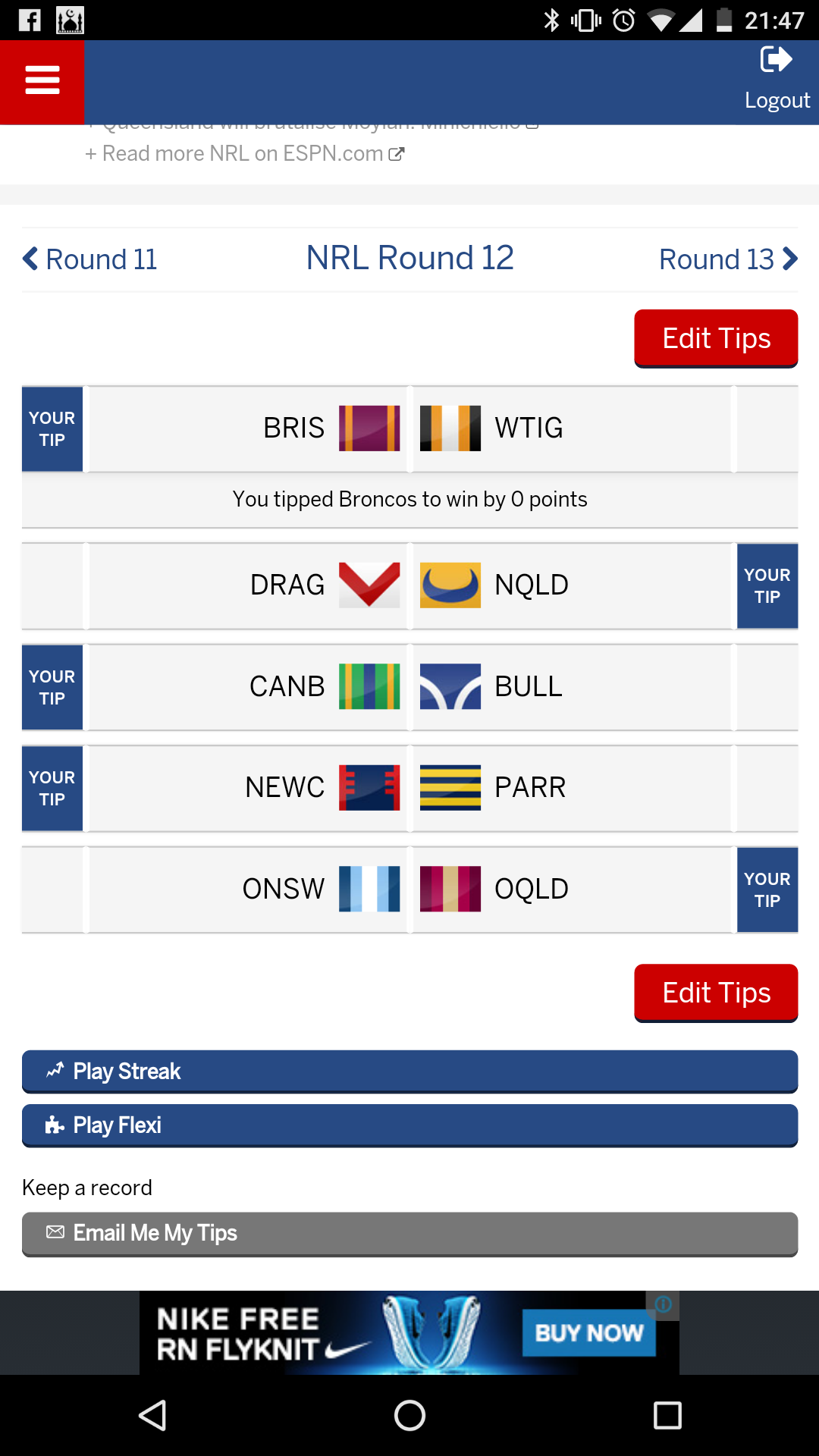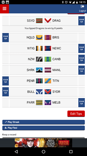IMPORTANT : Remember to submit your tip for tomorrow nights State of Origin, if you haven’t already. Tips for the SOO will be accepted until 7.30pm AEST.
