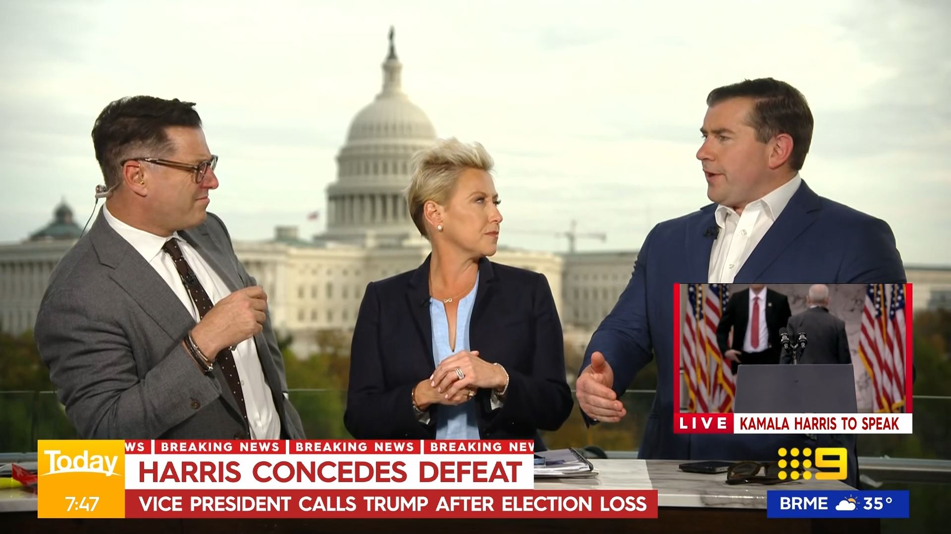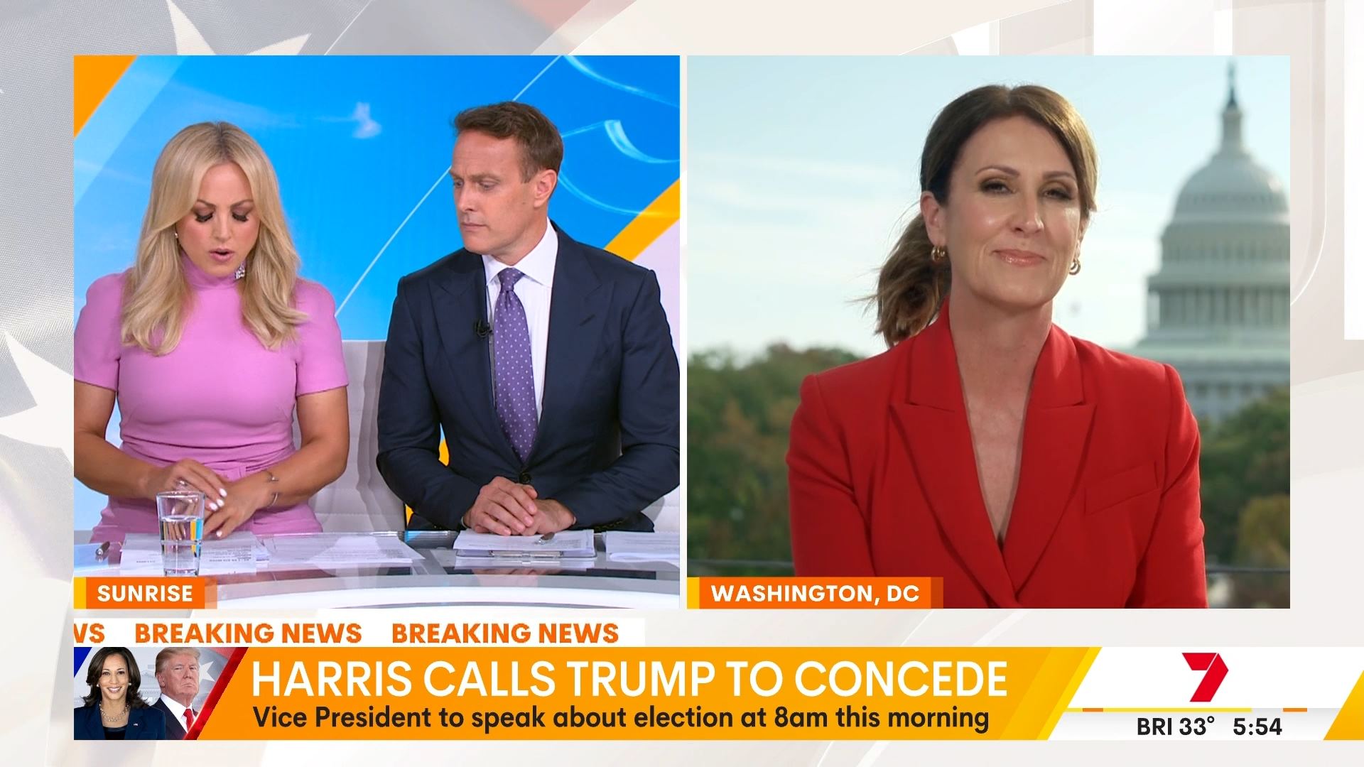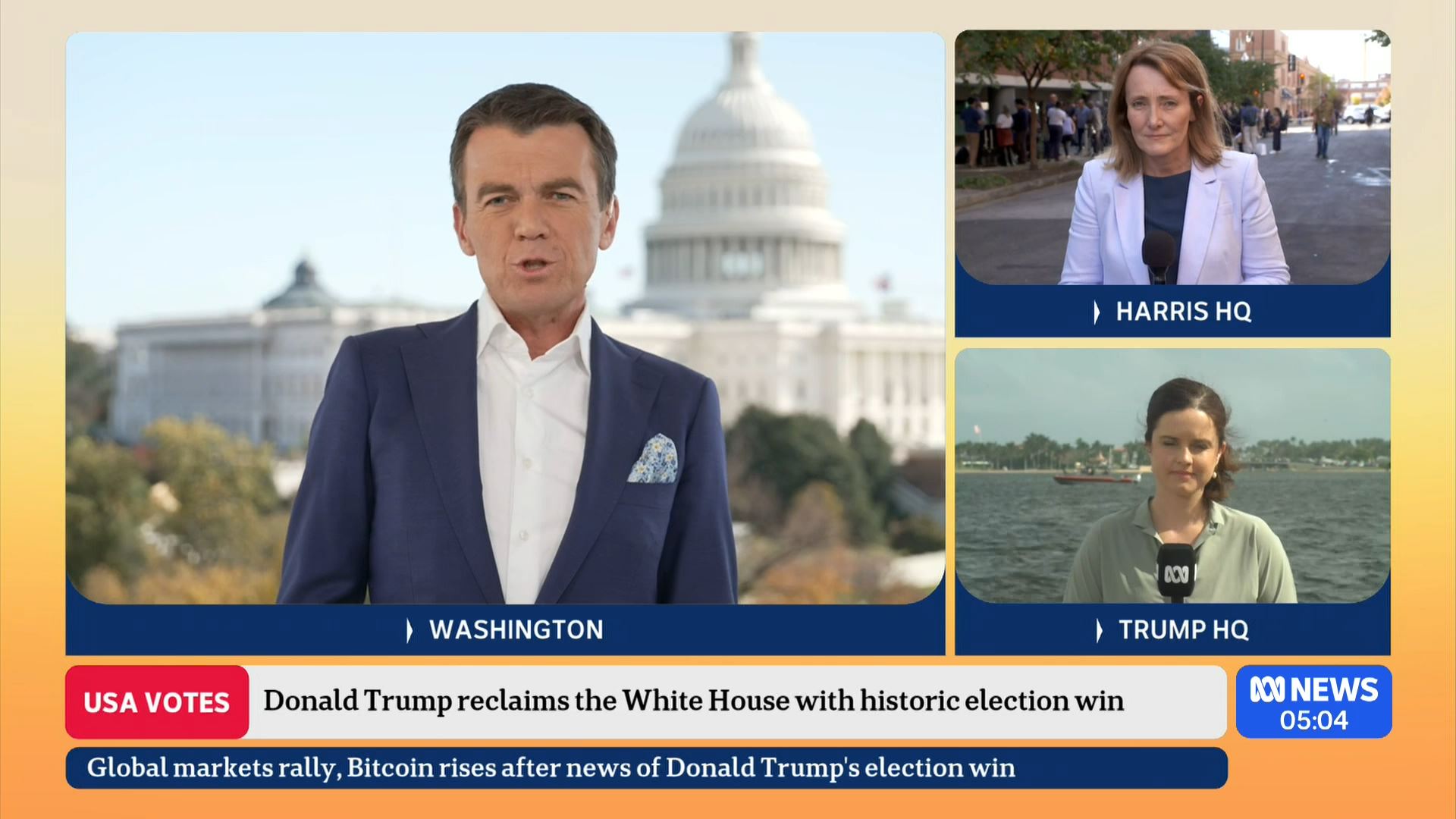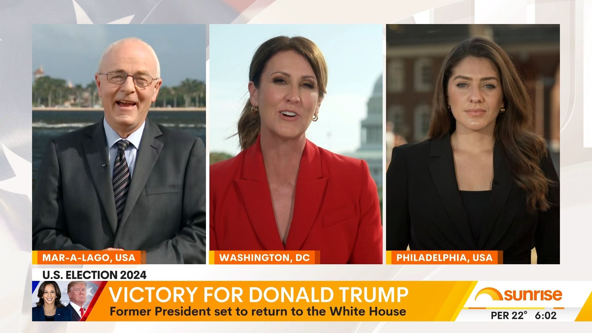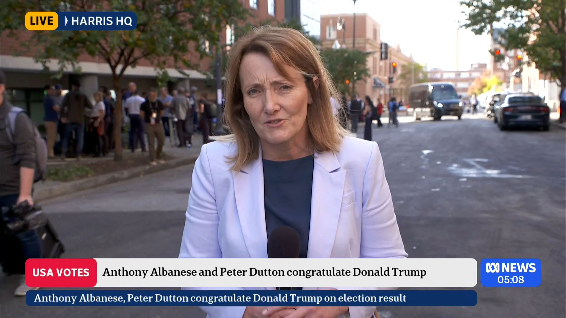 After this crosses to Tim Lester outside Trump HQ, David Woiwood at Harris HQ, Mylee Hogan in Pennsylvania and Mark Riley at Parliament House. Probably look lives, they were effectively the same as what aired in Sydney except for the reporters using Daniel’s name.