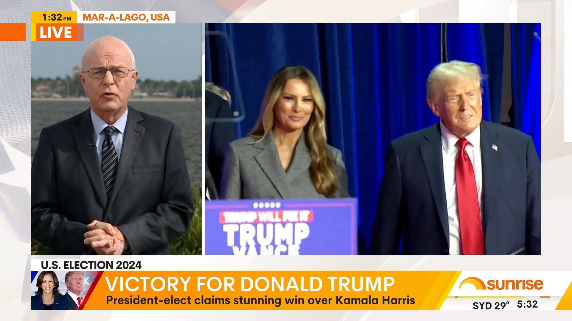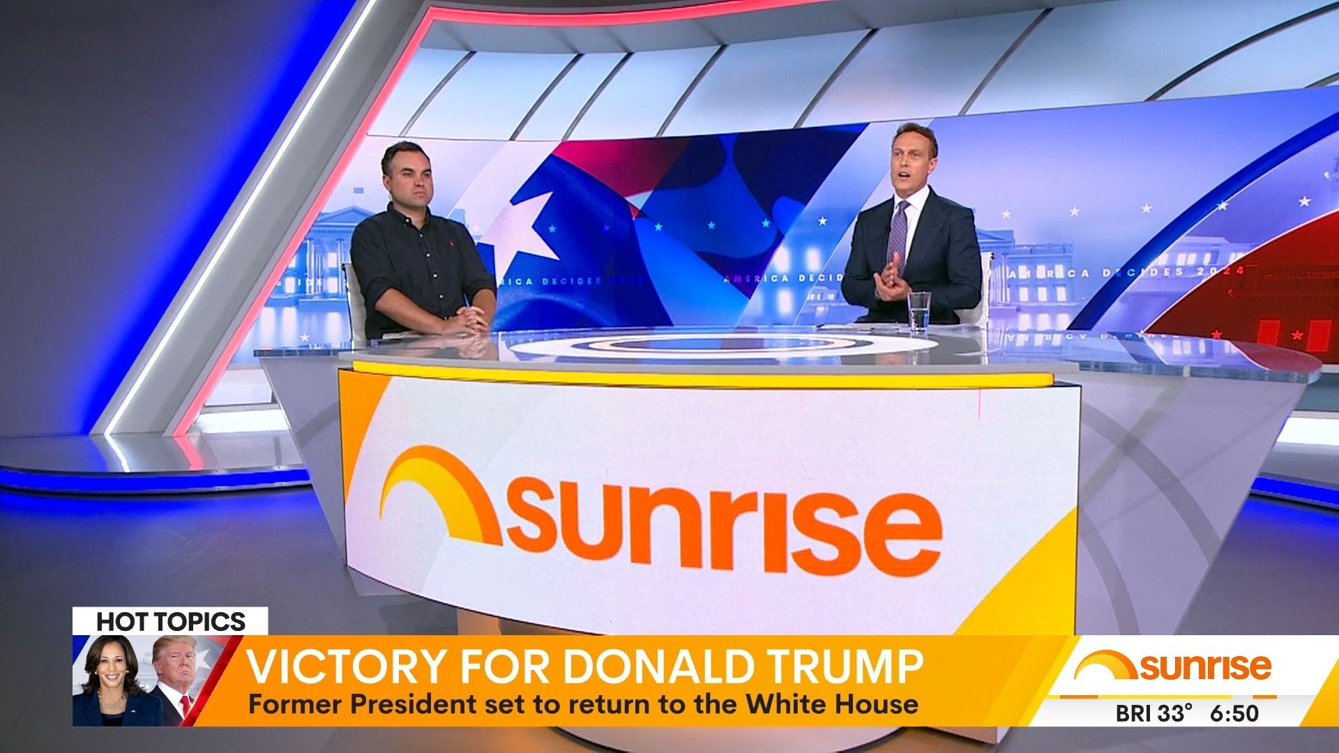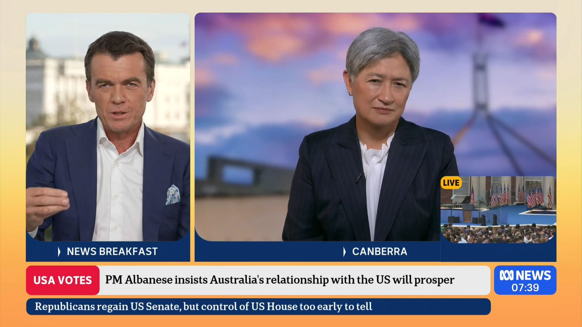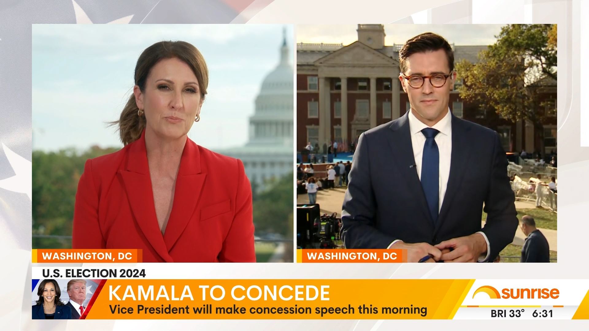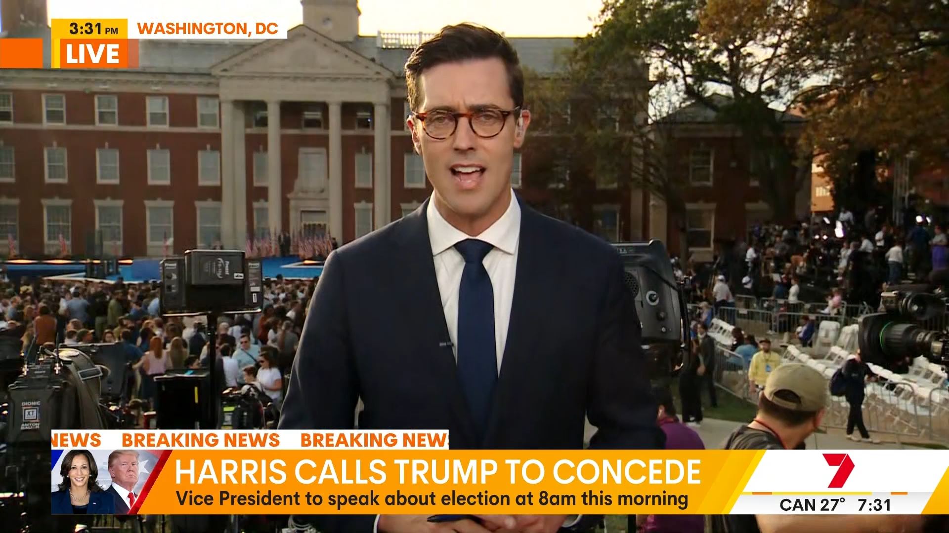 After this crosses to Tim Lester outside Trump HQ, David Woiwood at Harris HQ, Mylee Hogan in Pennsylvania and Mark Riley at Parliament House. Probably look lives, they were effectively the same as what aired in Sydney except for the reporters using Daniel’s name.