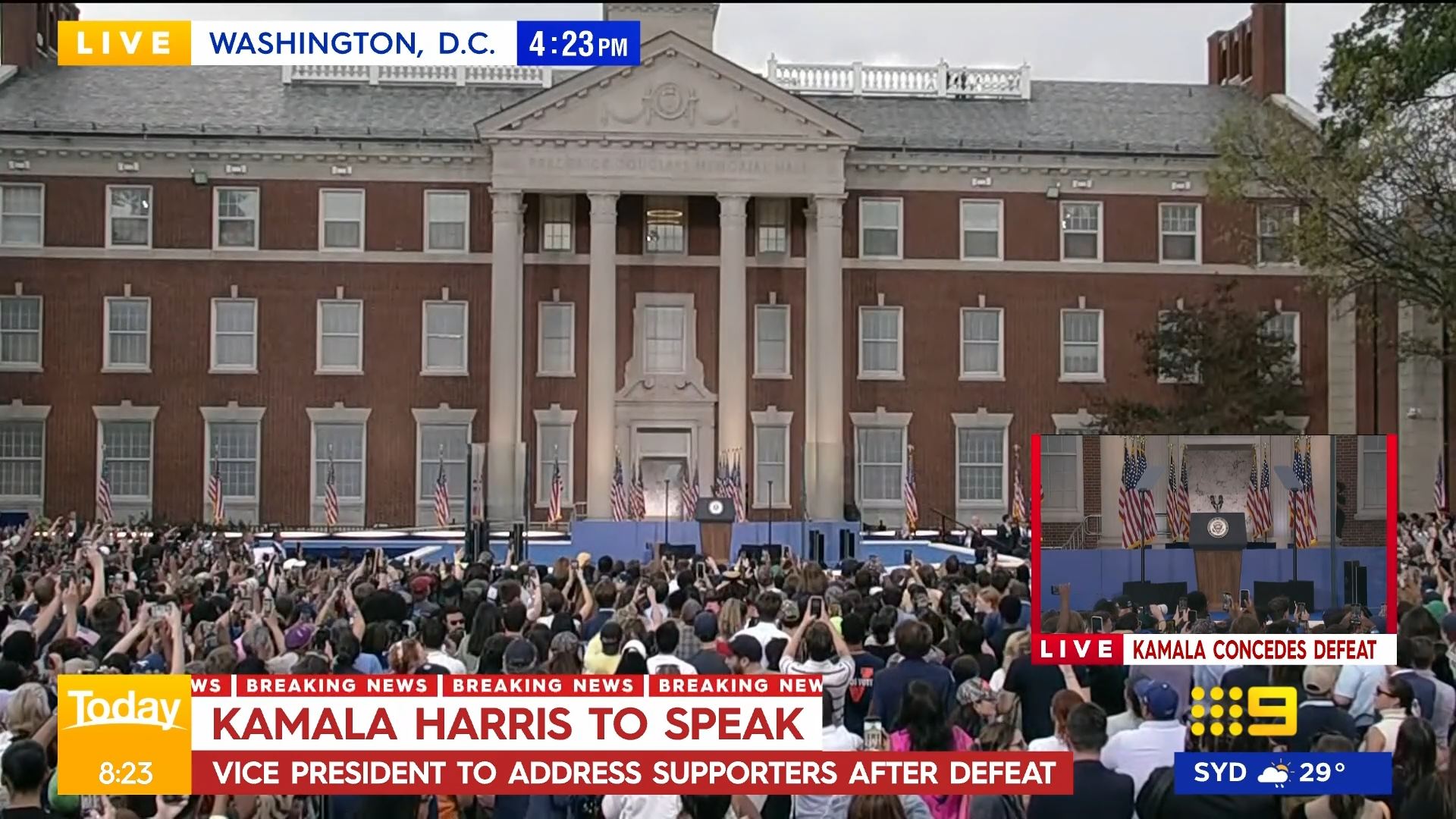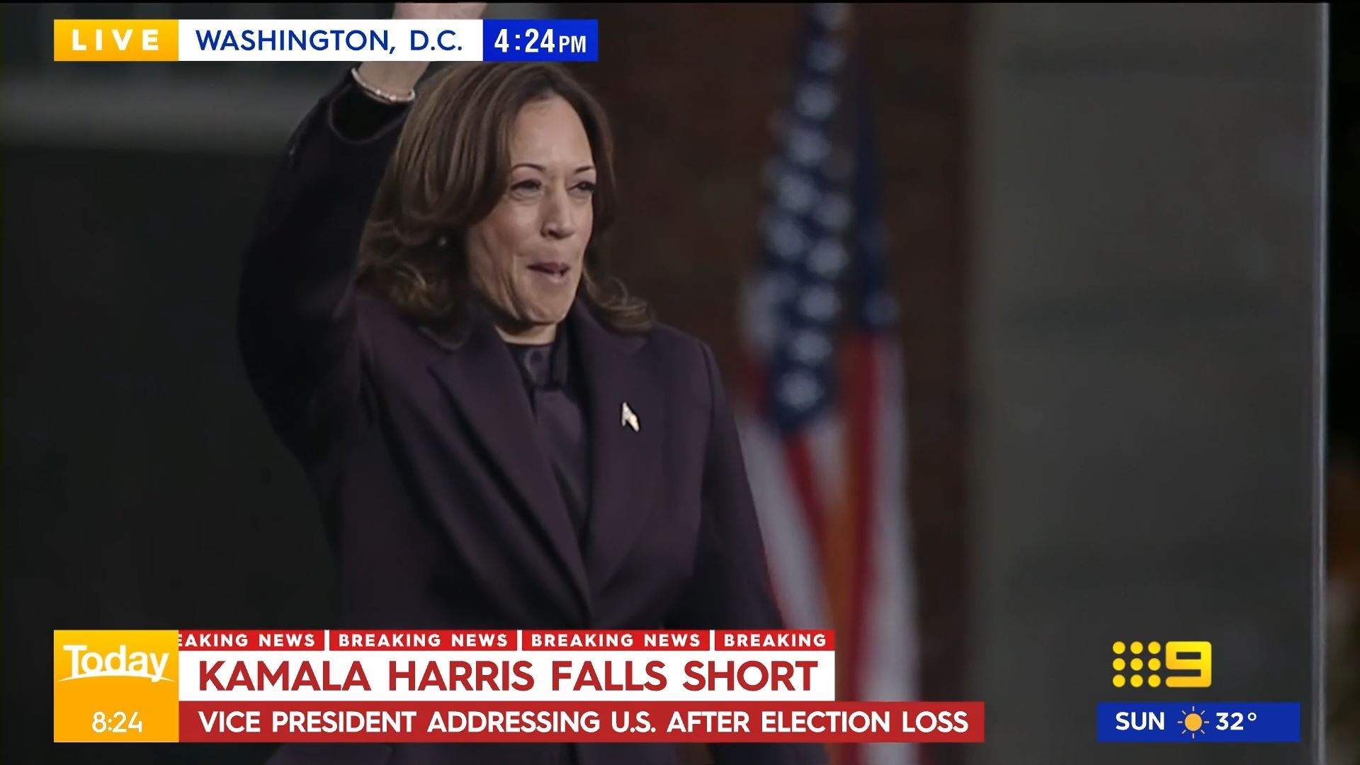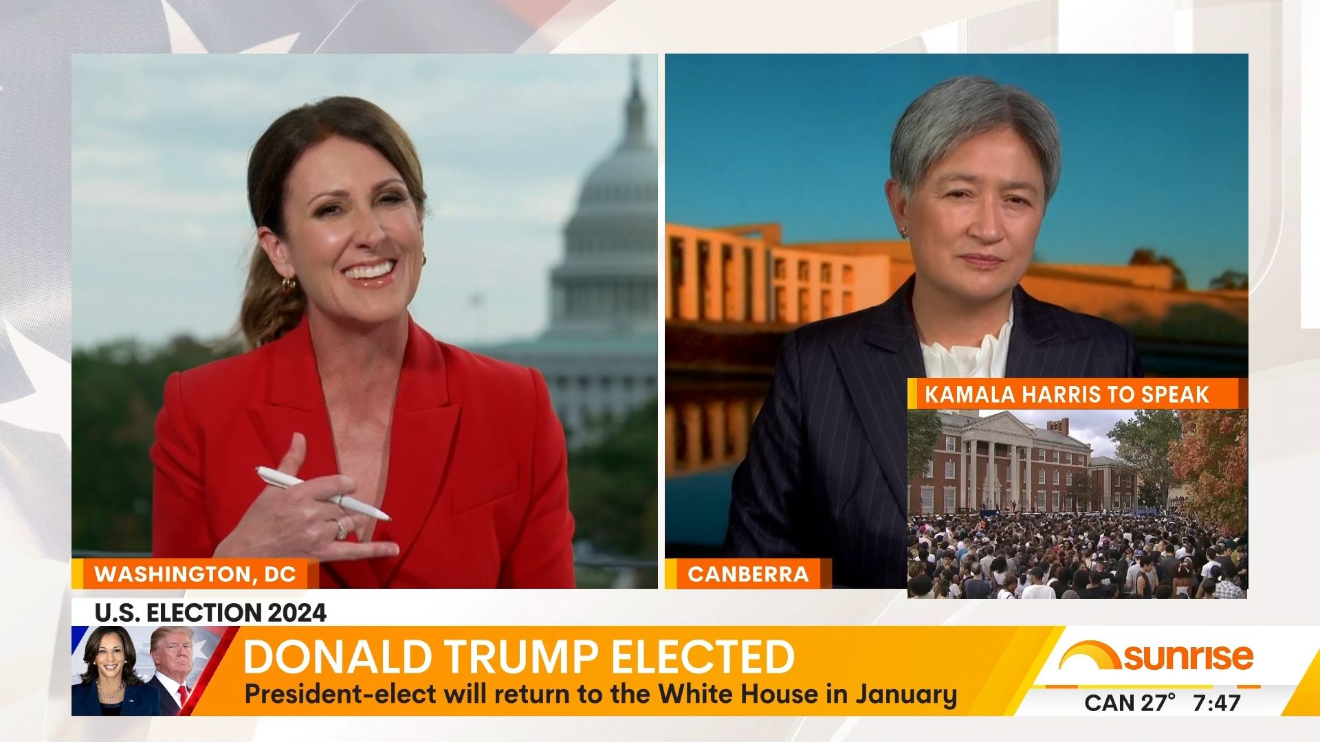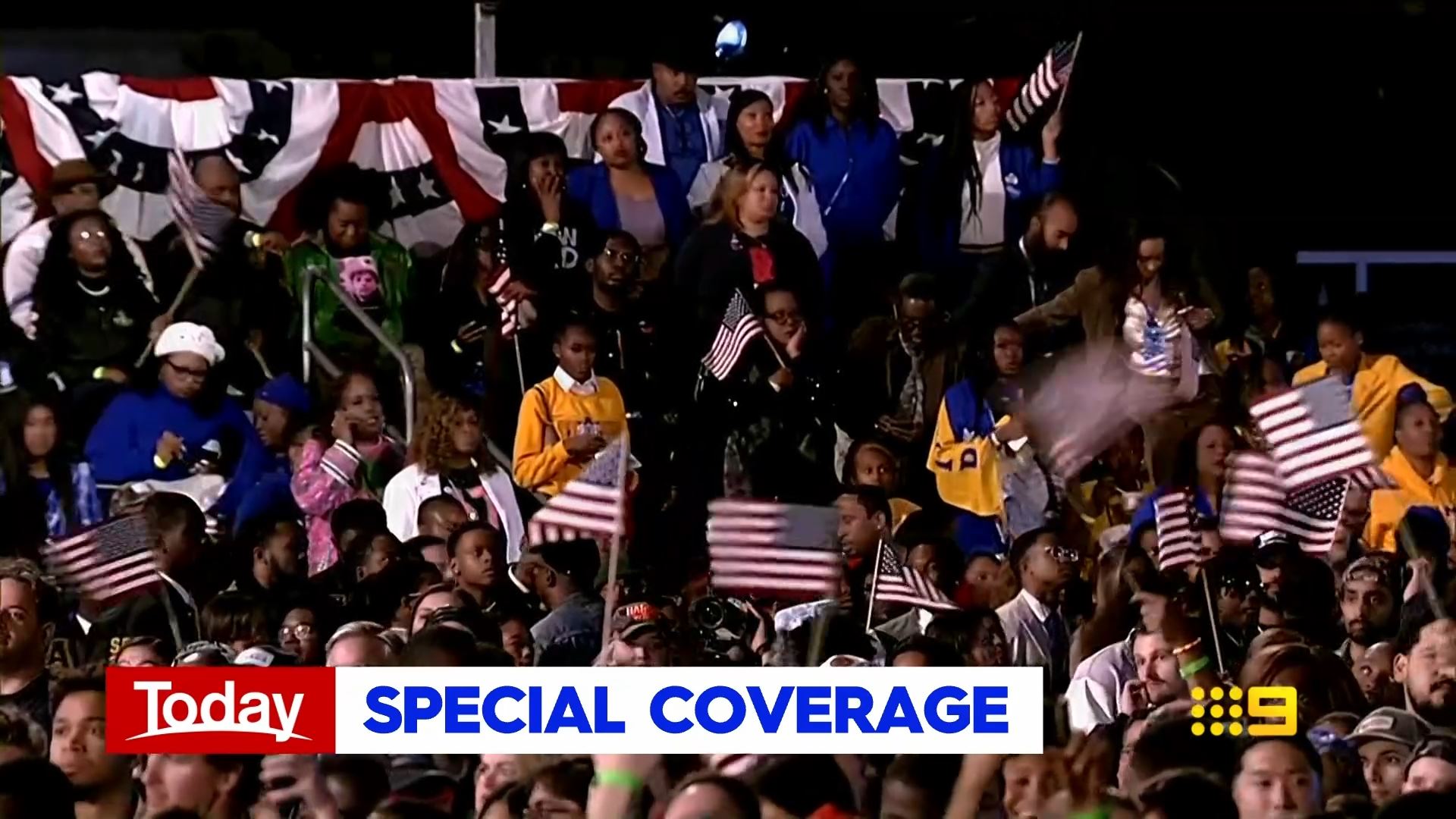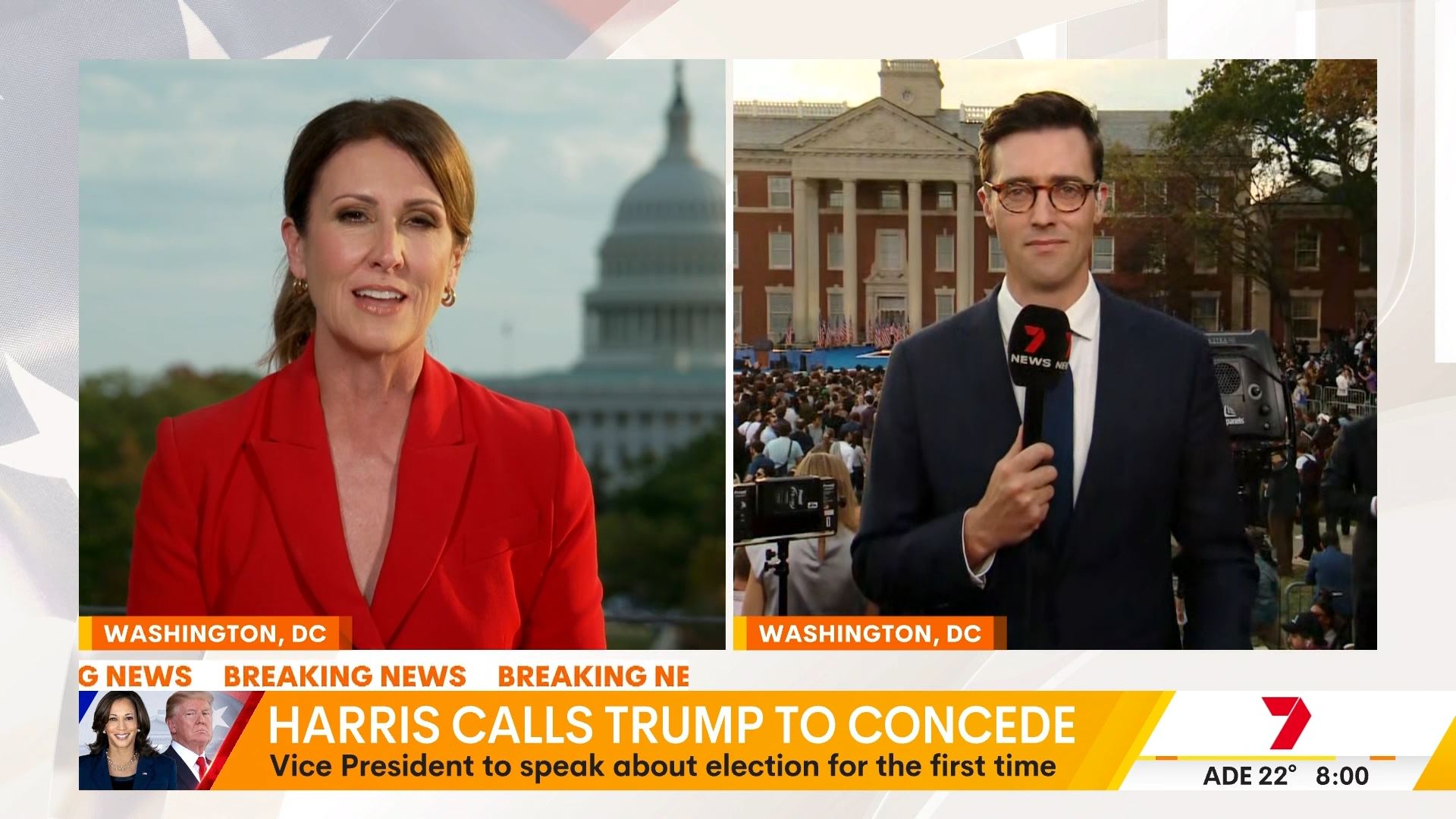 After this crosses to Tim Lester outside Trump HQ, David Woiwood at Harris HQ, Mylee Hogan in Pennsylvania and Mark Riley at Parliament House. Probably look lives, they were effectively the same as what aired in Sydney except for the reporters using Daniel’s name.