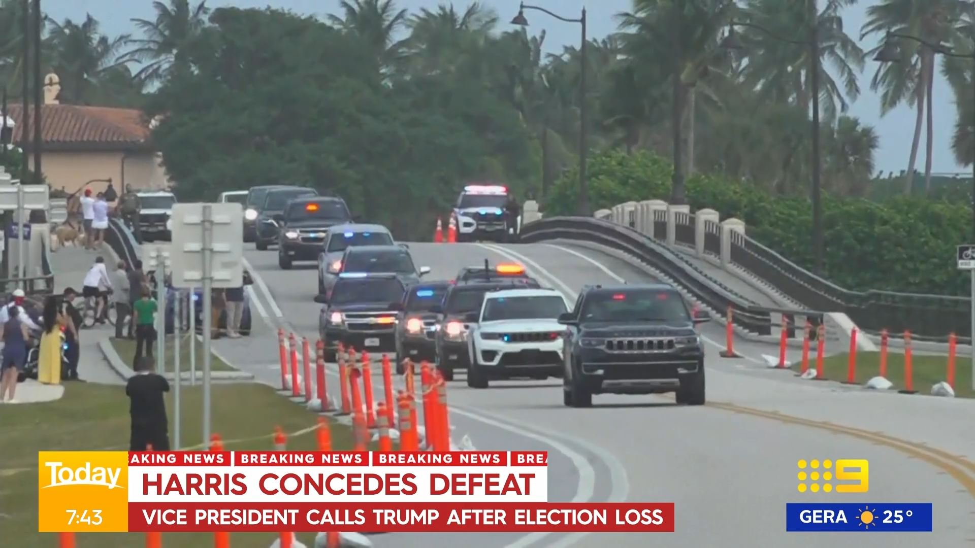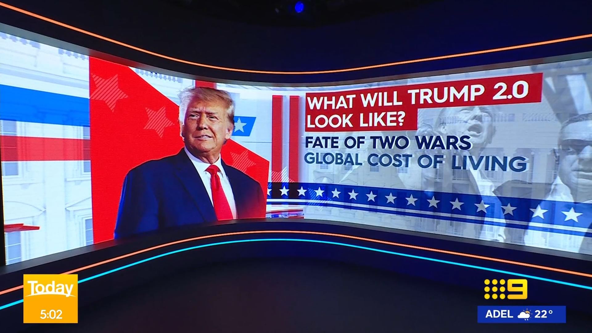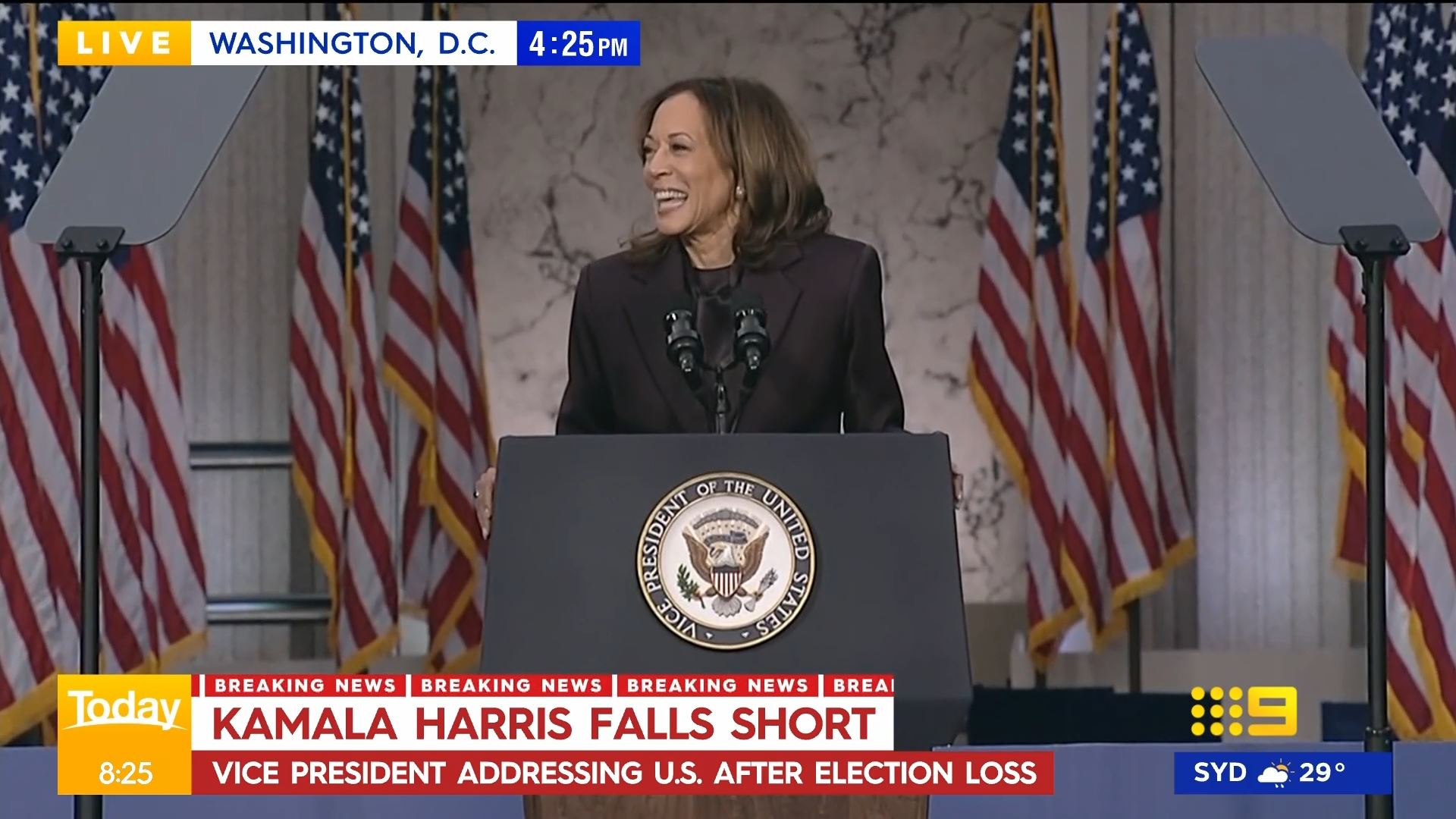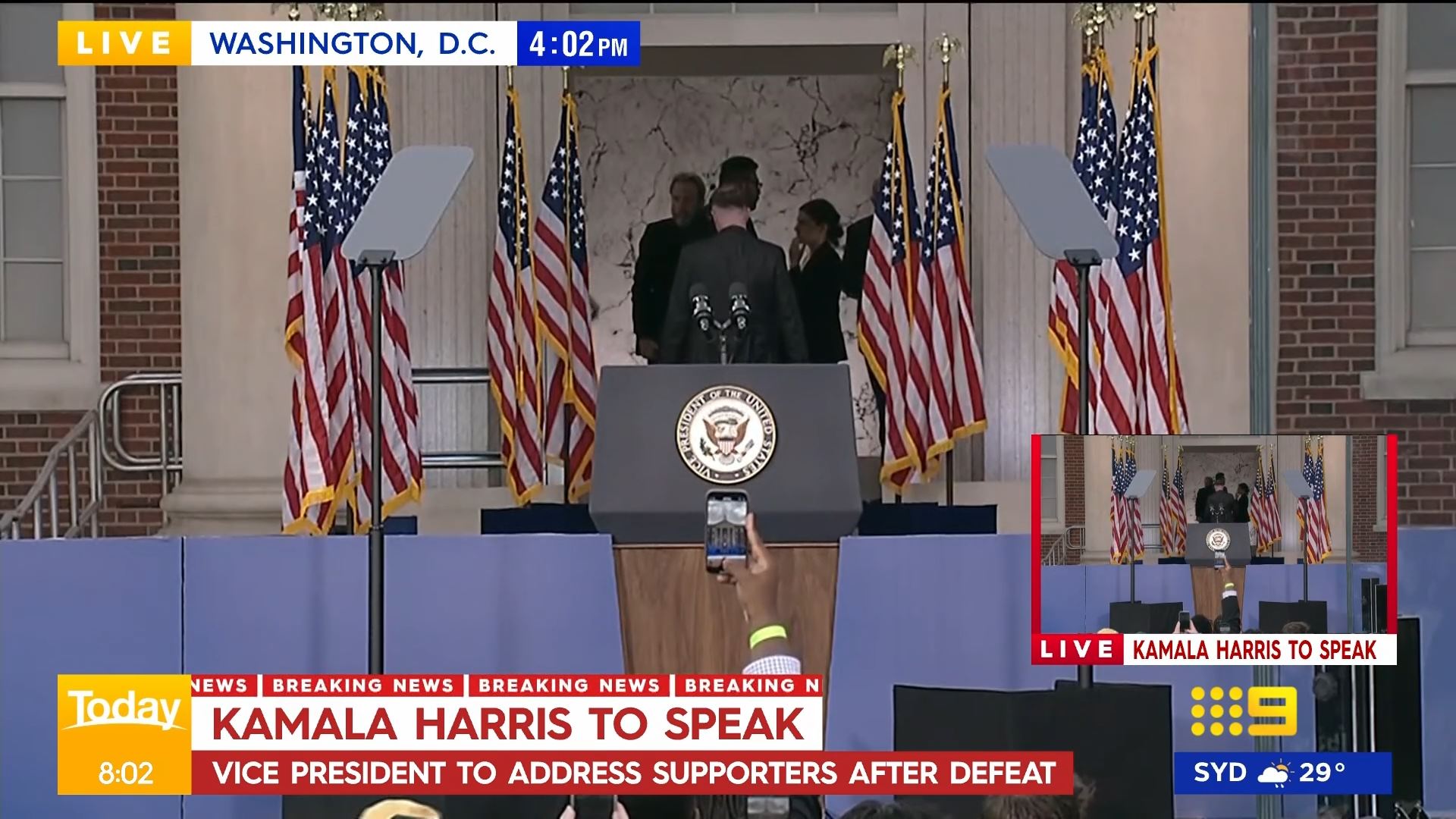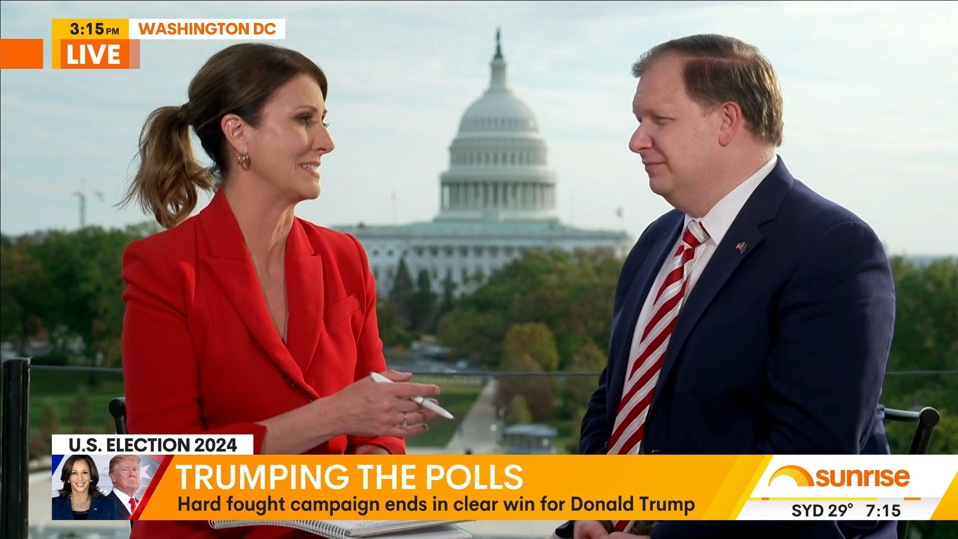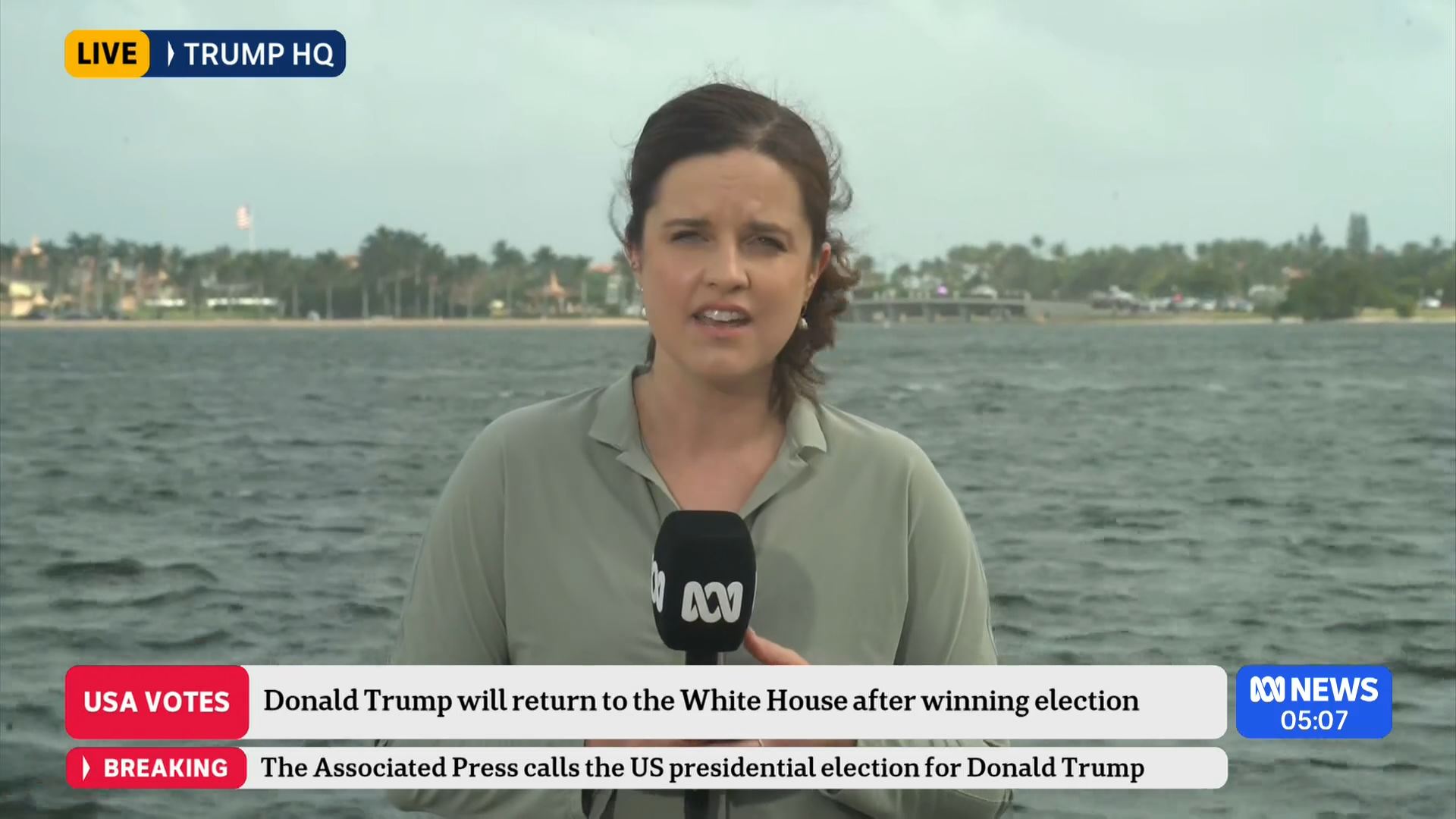 After this crosses to Tim Lester outside Trump HQ, David Woiwood at Harris HQ, Mylee Hogan in Pennsylvania and Mark Riley at Parliament House. Probably look lives, they were effectively the same as what aired in Sydney except for the reporters using Daniel’s name.