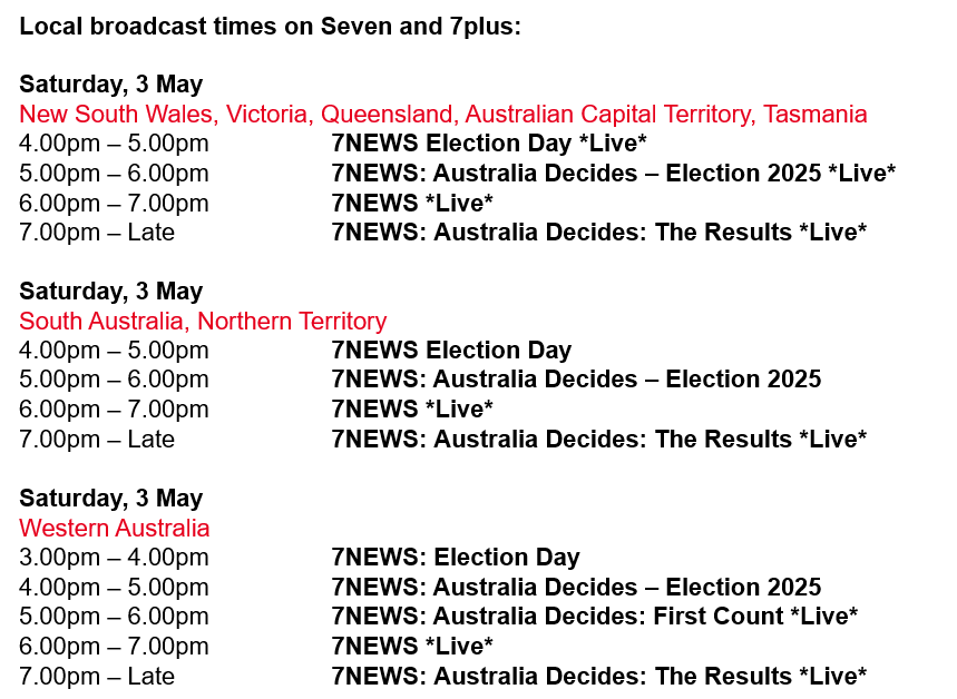 Seven’s election broadcast kicks off first at 4:00pm AEST Saturday, 3 May, on Seven and 7plus, with a special national edition of 7NEWS.