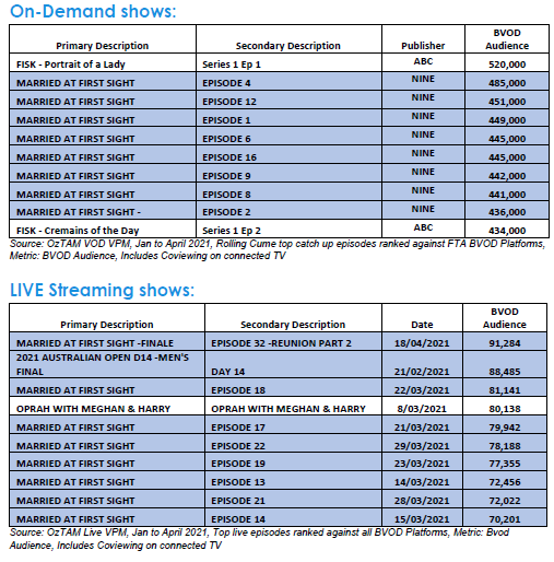 So far this year Nine’s Married at First Sight has eight of the Top 10 in on-demand programs and nine of the Top 10 live BVOD programs, while LEGO Masters also continues to perform strongly in the weekly BVOD ratings.