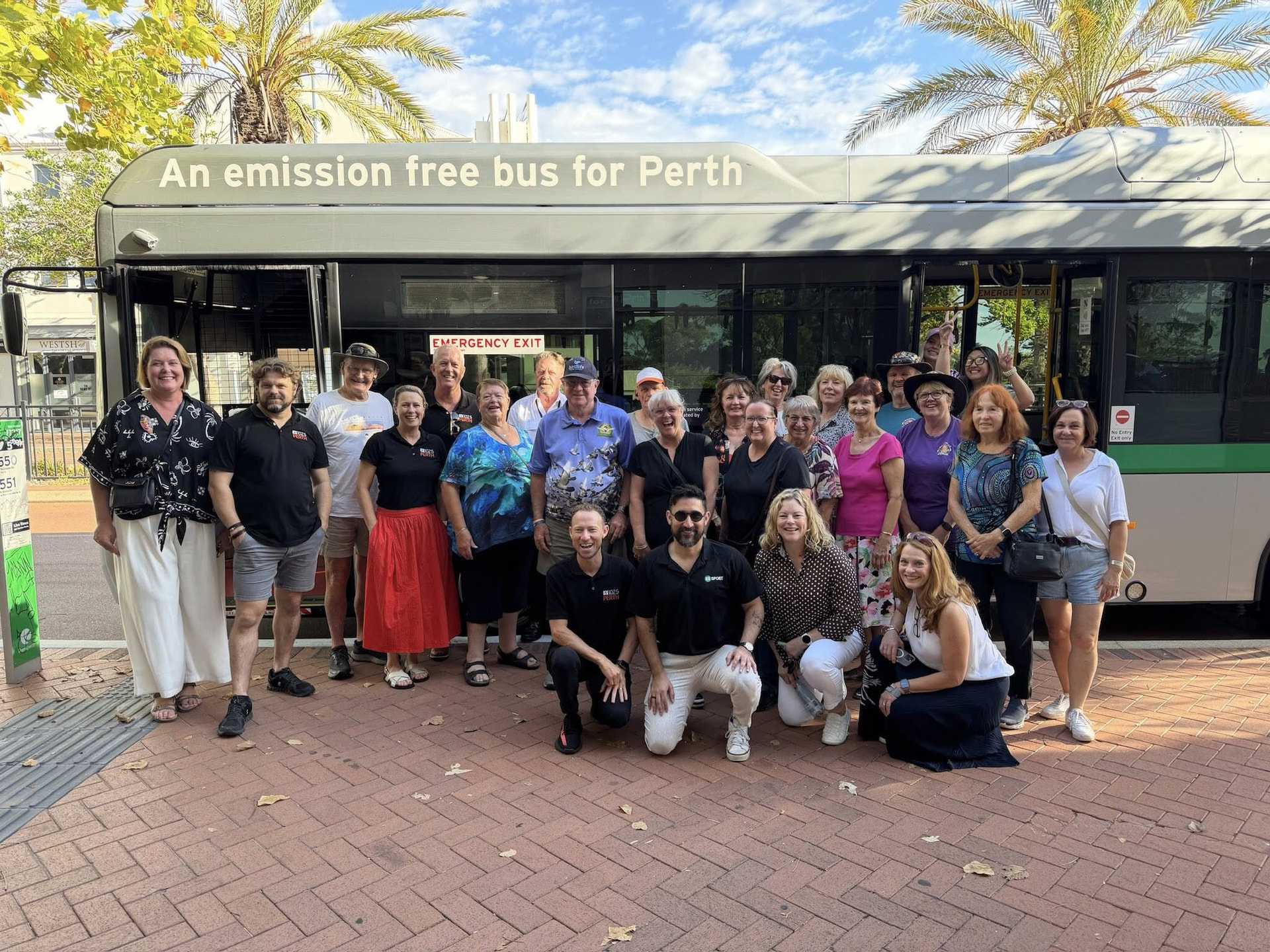 Mark Gibson hosted his Perth breakfast show on an electric public bus yesterday, driven across the city from Butler in the outer north to Rockingham in the outer south west.
