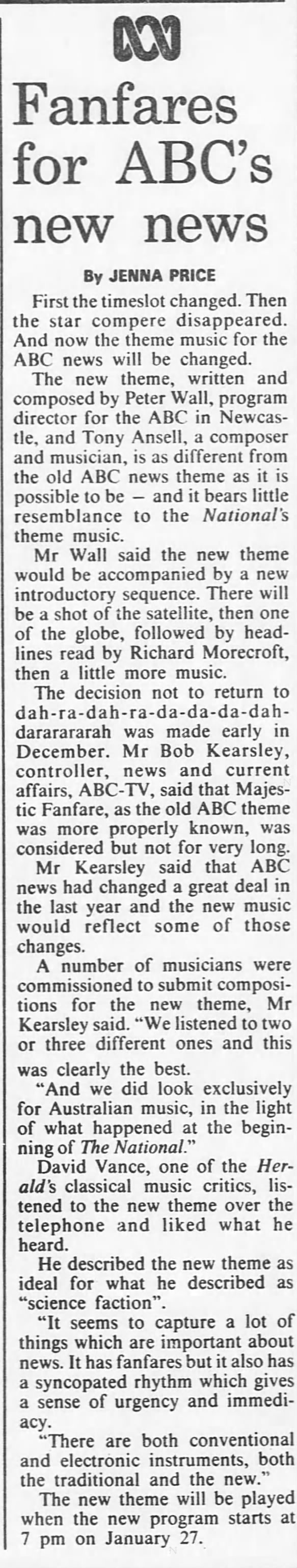Yesterday (27th) marked the 40th anniversary of the debut of the Ansell and Wall ABC News theme. It debuted on 7 pm bulletins on Monday, 27th January 1986.