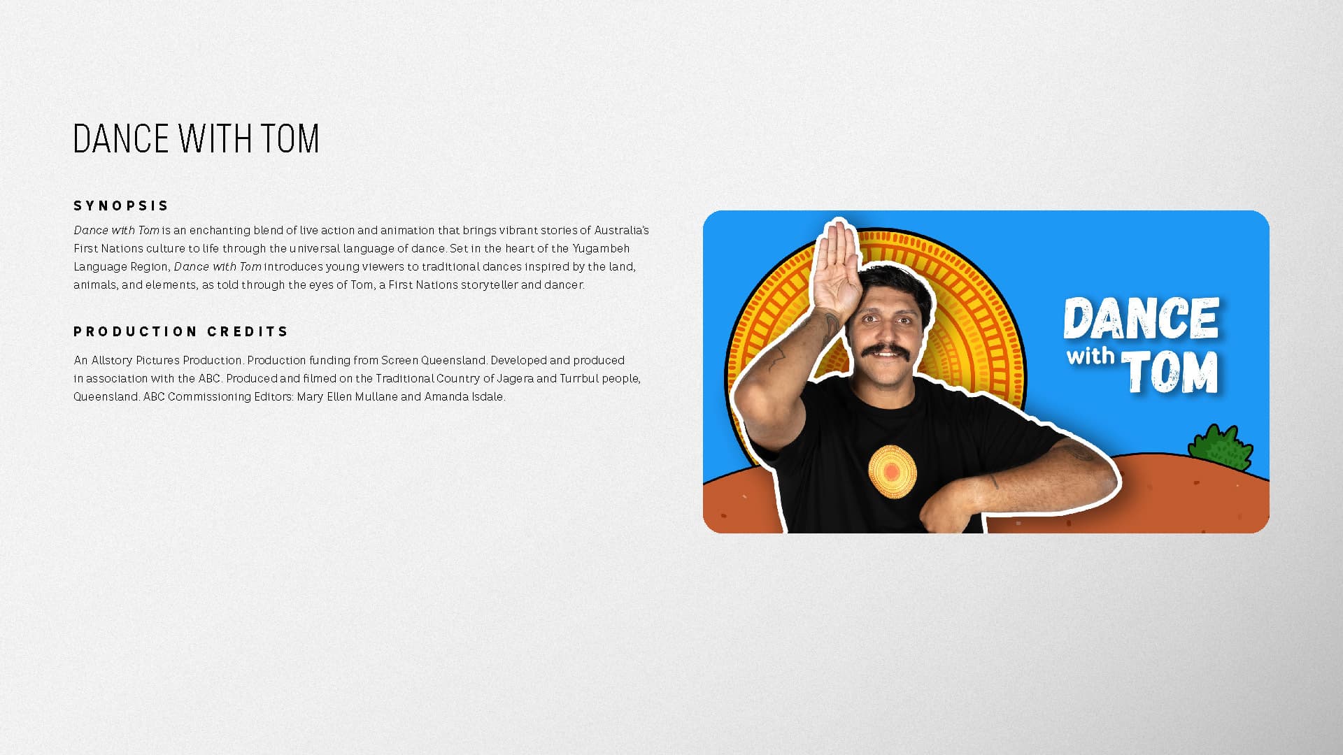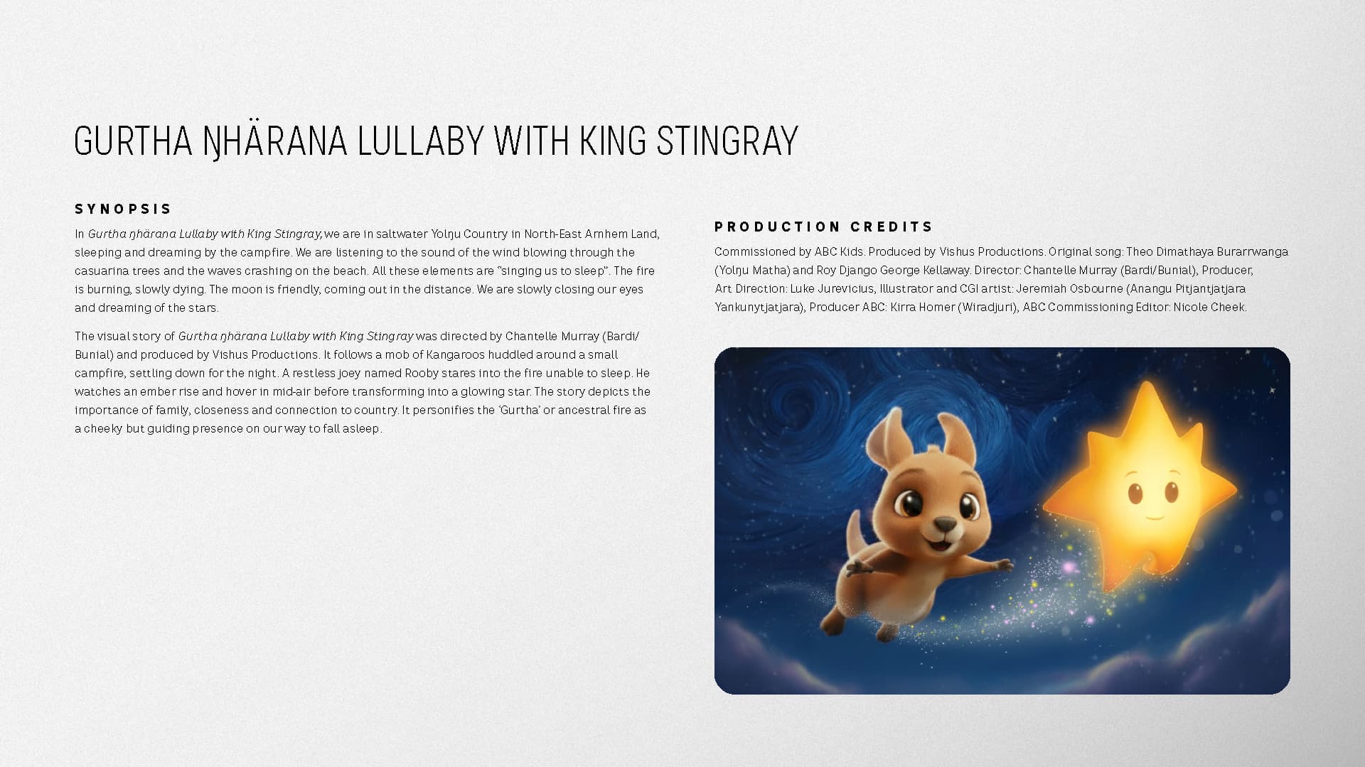 Dance with Tom brings vibrant stories of Australia’s First Nations culture to life through dance. Also coming to ABC Kids is a new Indigenous Lullaby from King Stingray, called Gurtha ŋhärana .