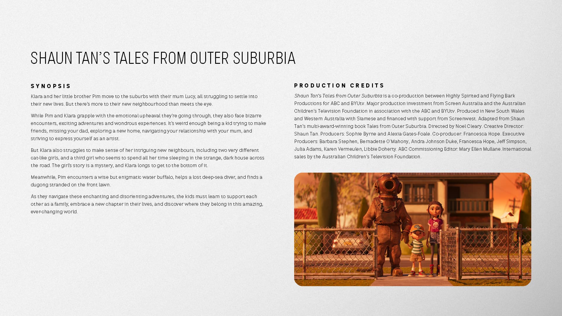 Shaun Tan’s Tales from Outer Suburbia brings the beloved book to screen, following siblings Klara and Pim as they encounter a series of miraculous adventures over their summer holidays. In Caper Crew , Amelia and Kai Delaney’s quiet lives are upended when their con-artist Grandmother Queenie turns up, teaching them the art of the grift.