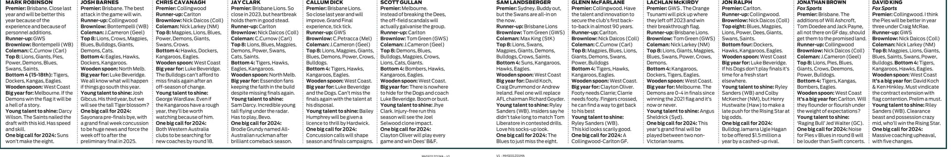 Here were the predictions from Herald Sun reporters from March this year. Sam Landsberger (who died after he was hit by a car while crossing a street in Richmond in August) was the only person to correctly tip the Sydney-Brisbane match-up in the grand final. Five journalists tipped the Lions to take the premiership cup.