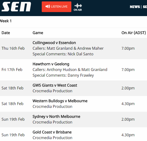 It is already known that SEN have the rights to every timeslot, with Twilight games during the regular season being sourced from Crocmedia. It would seem, based on this week, that games played outside of Melbourne or Tasmania in timeslots which SEN have broadcast rights may also be sourced from Crocmedia in most cases.