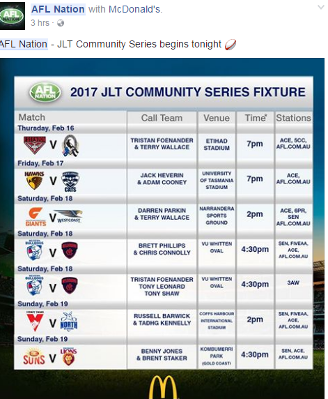 The preseason competition starts tonight. Crocmedia’s AFL Nation has a post on Facebook with the callers and stations for the weekend, and it looks like Crocmedia are producing the coverage for a number of metro stations. Notably, calls which involve either 3AW or SEN seem to use a combination of Crocmedia and the metro station’s talent.