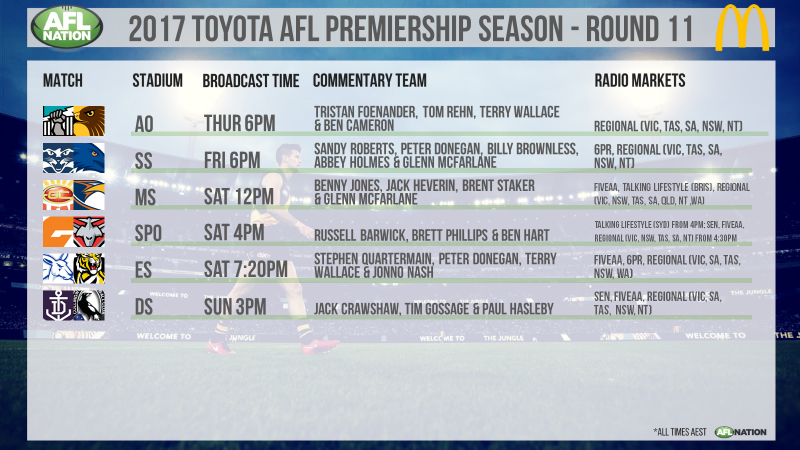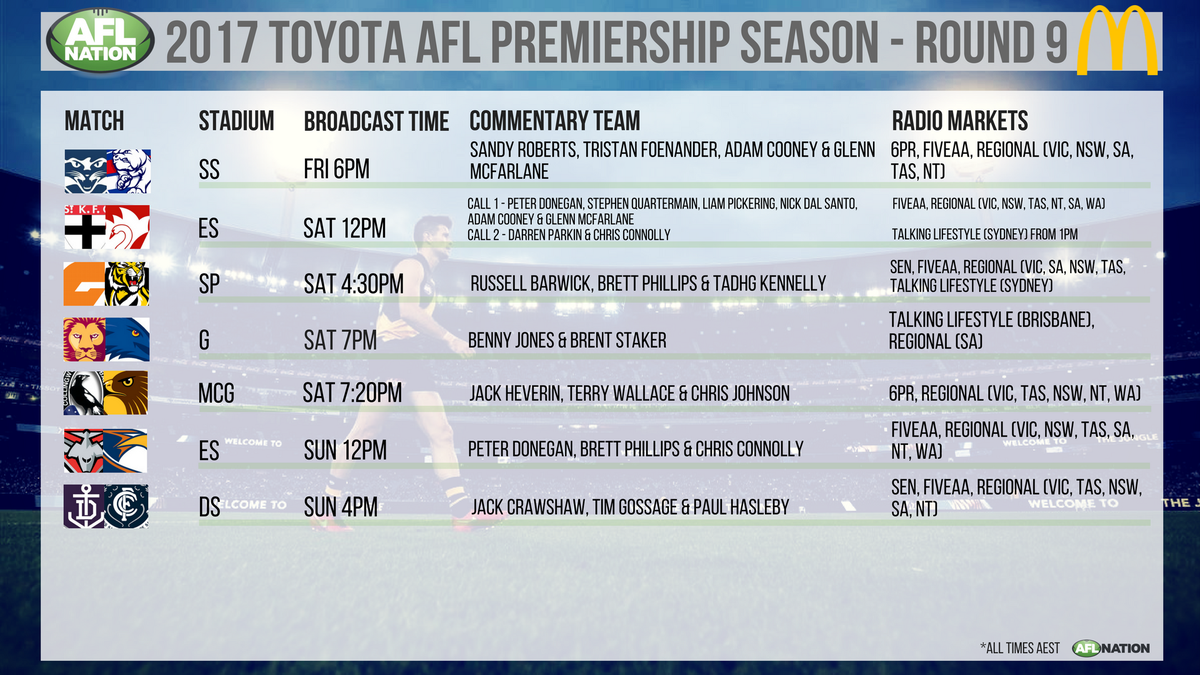 According to 3AW website, it will take 5AA call of the Port v Suns game before crossing to Melbourne for the second half of North Melbourne v Sydney at 6pm. It will be up to 5AA commentators to provide score updates of the first half of the late match.