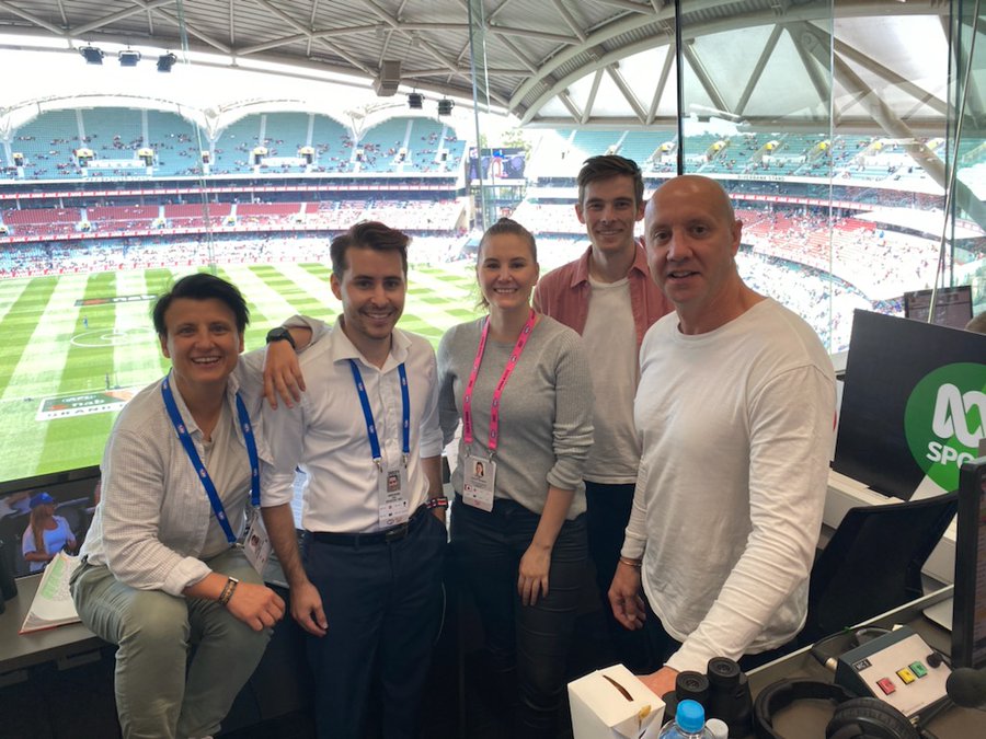 ABC Radio’s commentary team for today’s AFLW Grand Final at Adelaide Oval: (from left) Chyloe Kurdas, Aaron Bryans, Jessica Webster, Joel Peterson and Rod Jameson.