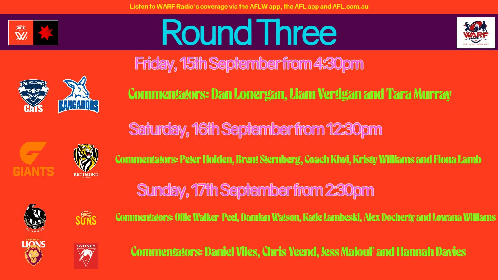 The core members of 3AW’s AFLW commentary team is: host Melissa Fistric (musician and producer/host on ABC Radio Gippsland on weekdays), former Carlton AFLW coach Damien Keeping, and 3AW breakfast producer Amelia Fuller as boundary reporter. Expert commentators include Carlton player Abbie McKay, and Melbourne premiership player Libby Birch, who is also part of the station’s AFL commentary team.