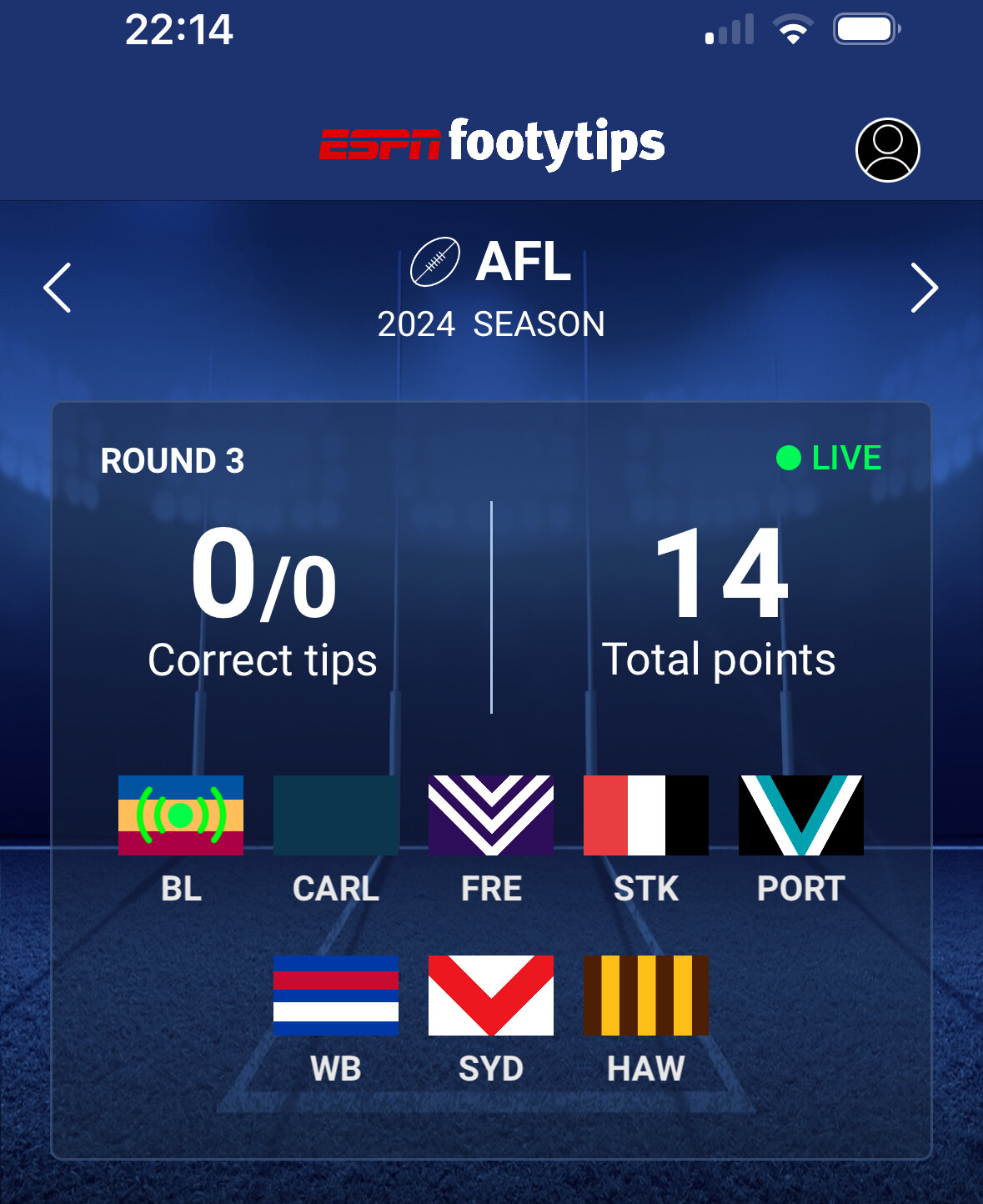 Well done to @trentcs, @stmookeyj027 and @TBoy for winning the round with 6 correct tips! Apologies for the mistake last week, it’s hopefully been fixed on this leaderboard.