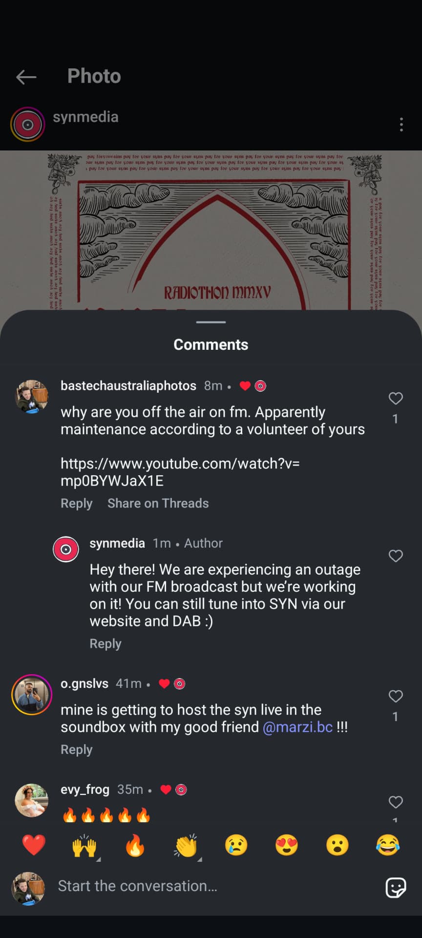 SYN have addressed the outage on their social media: SYN FM on Instagram: "Our FM broadcast is currently out of action đ„Č We are doing our best to get it back on air but in the meantime you can still tune into SYN via our web player at syn.org.au or via any digital radio app like @communityradioplus Stay tuned to SYN! đ»â€ïžâđ©č"