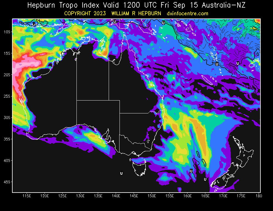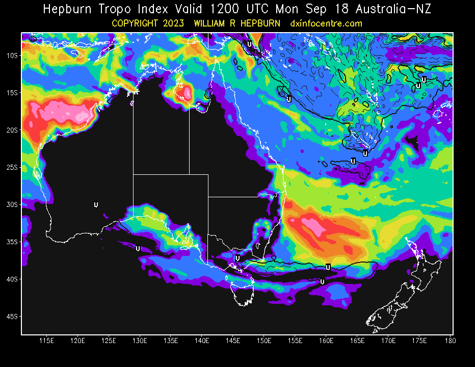 Long range, apart from moderate nightly Newcastle ducting for the next few nights, things get really interesting early next week. Monday / Tuesday at this stage looks to be the best chance for NZ tropo into coastal Sydney. Before this the NZ ducts are directed more into SE QLD and the far north coast of NSW.