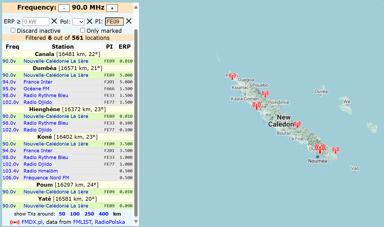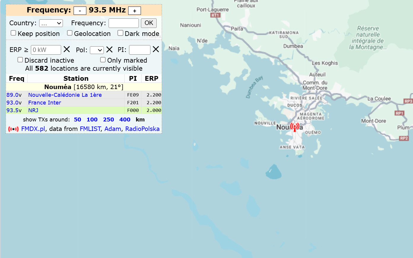 Interesting how the signal levels vary with frequency & time over the past hours from the same NCL tx site. The TX site shown above with Kone is misleading, but realistically no way to separate the frequencies with sites. Except in this case due to reception of Oceane 95.0 & Hepburn Maps & site height, reception has to surely be from Mont Koghis. (Dumbea)