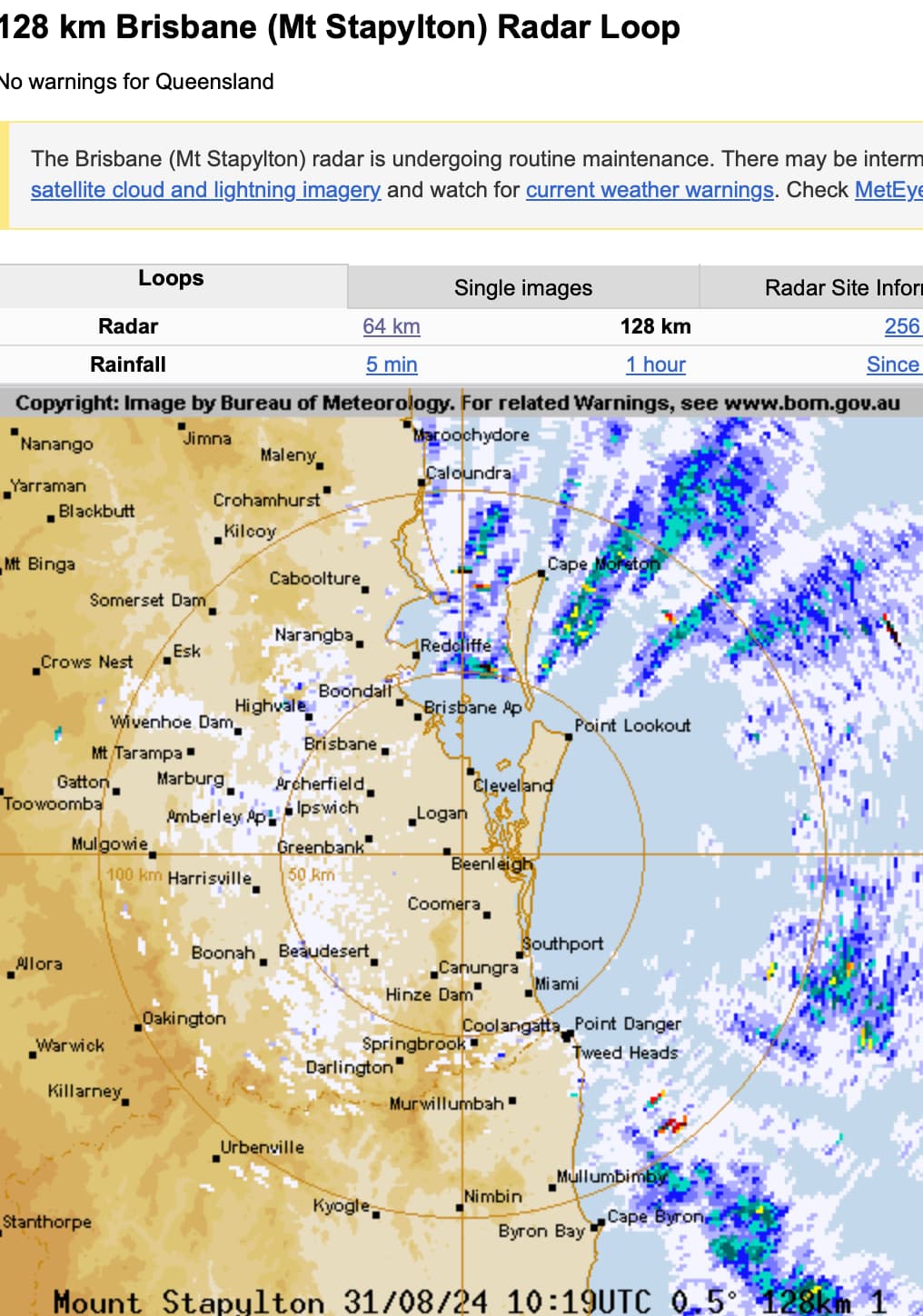 Amazing troposcatter visible on Brisbane BOM radar at present - clear cloudless sky in Brisbane at present. The give away is the radial presentation of the echo returns. This is similar to what you see if there is an interference source in the radar band. The maintenance window mentioned in the notice at the top is for 2/9-6/9 not tonight