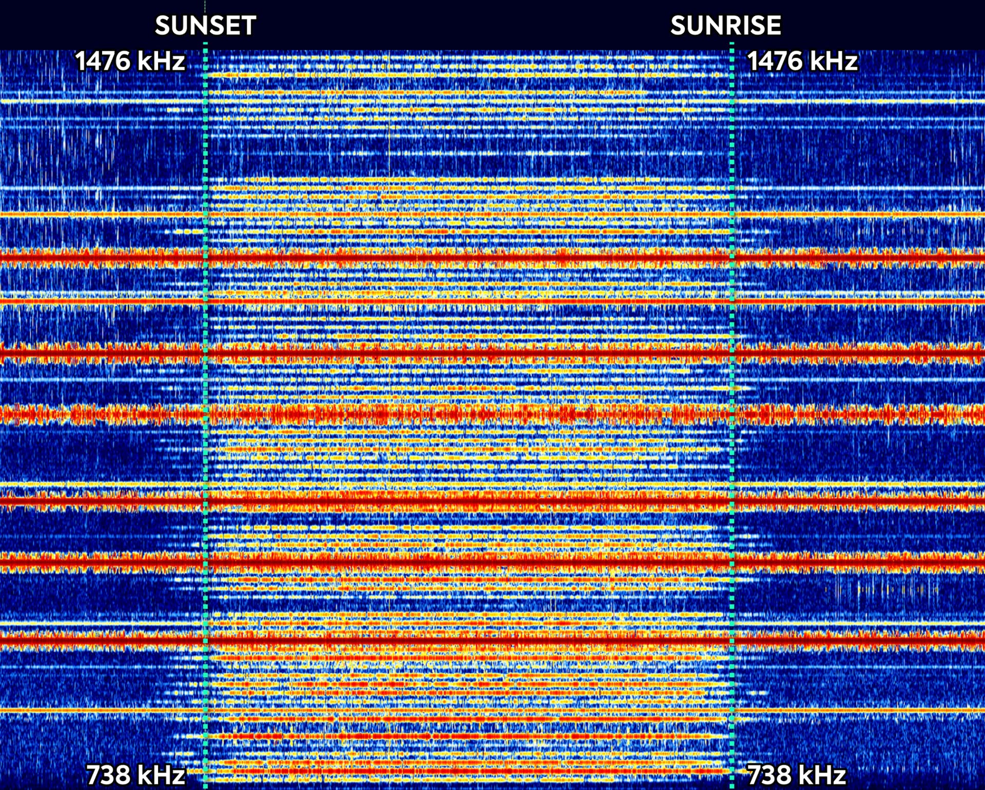 I did a recording of the AM band overnight. It’s interesting to see how the long-distance stations fade in and out along with sunset and sunrise: