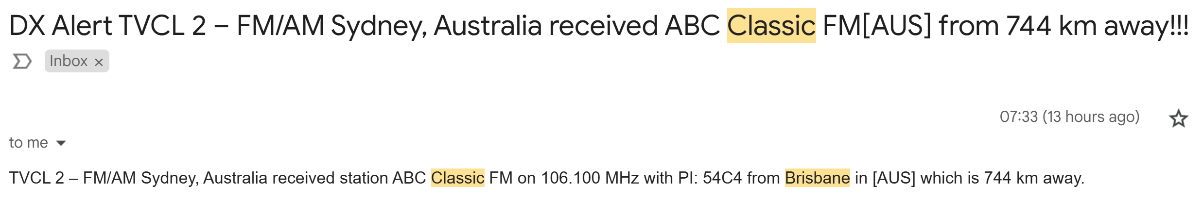 106.1 Classic Newcastle is regular reception on the TVCL2 server. It doesn’t have RDS though (as far as I know). The email was sent automatically when it matched the 54C4 PI code that ABC Brisbane transmits.