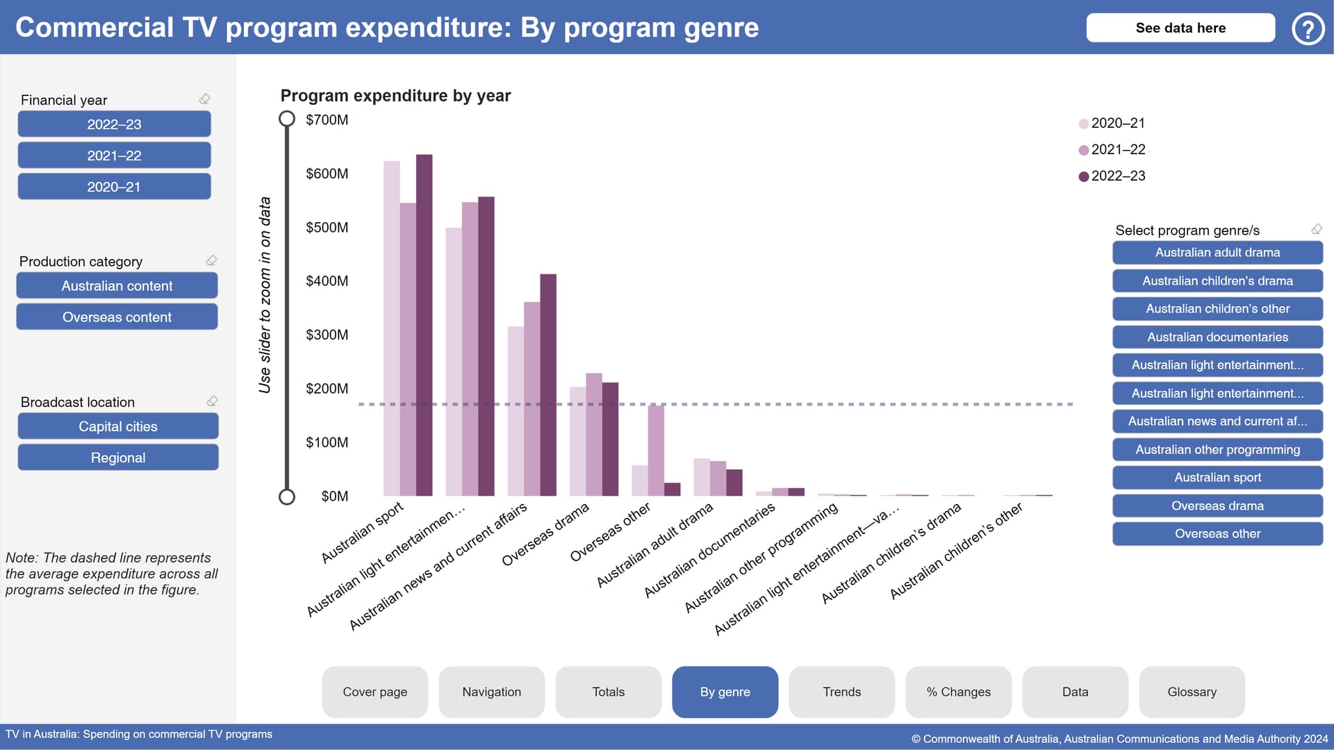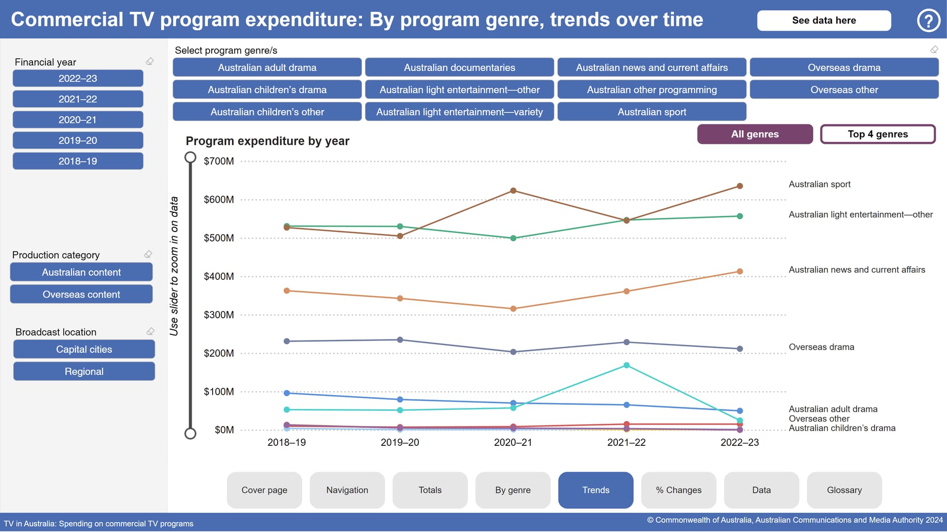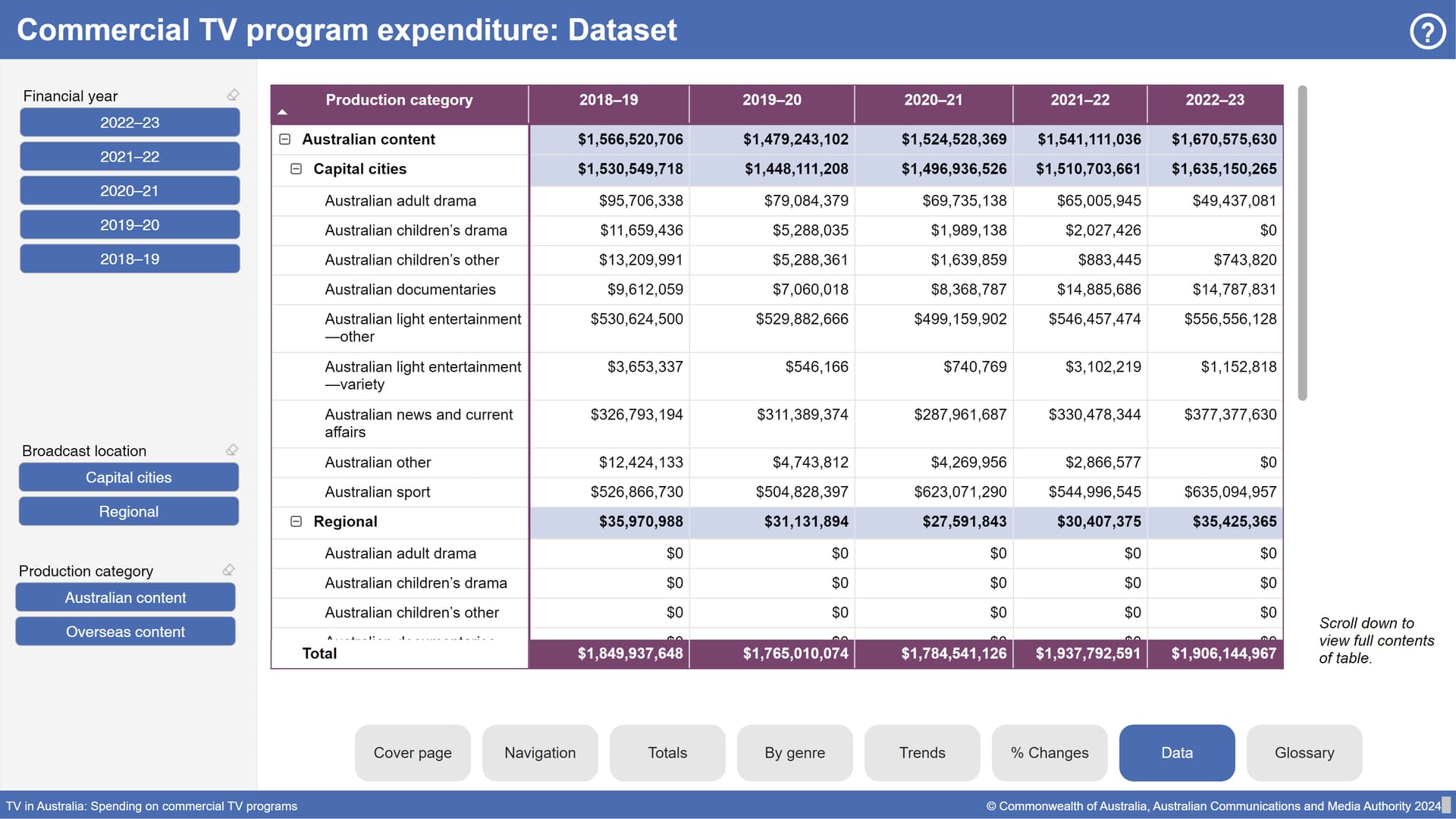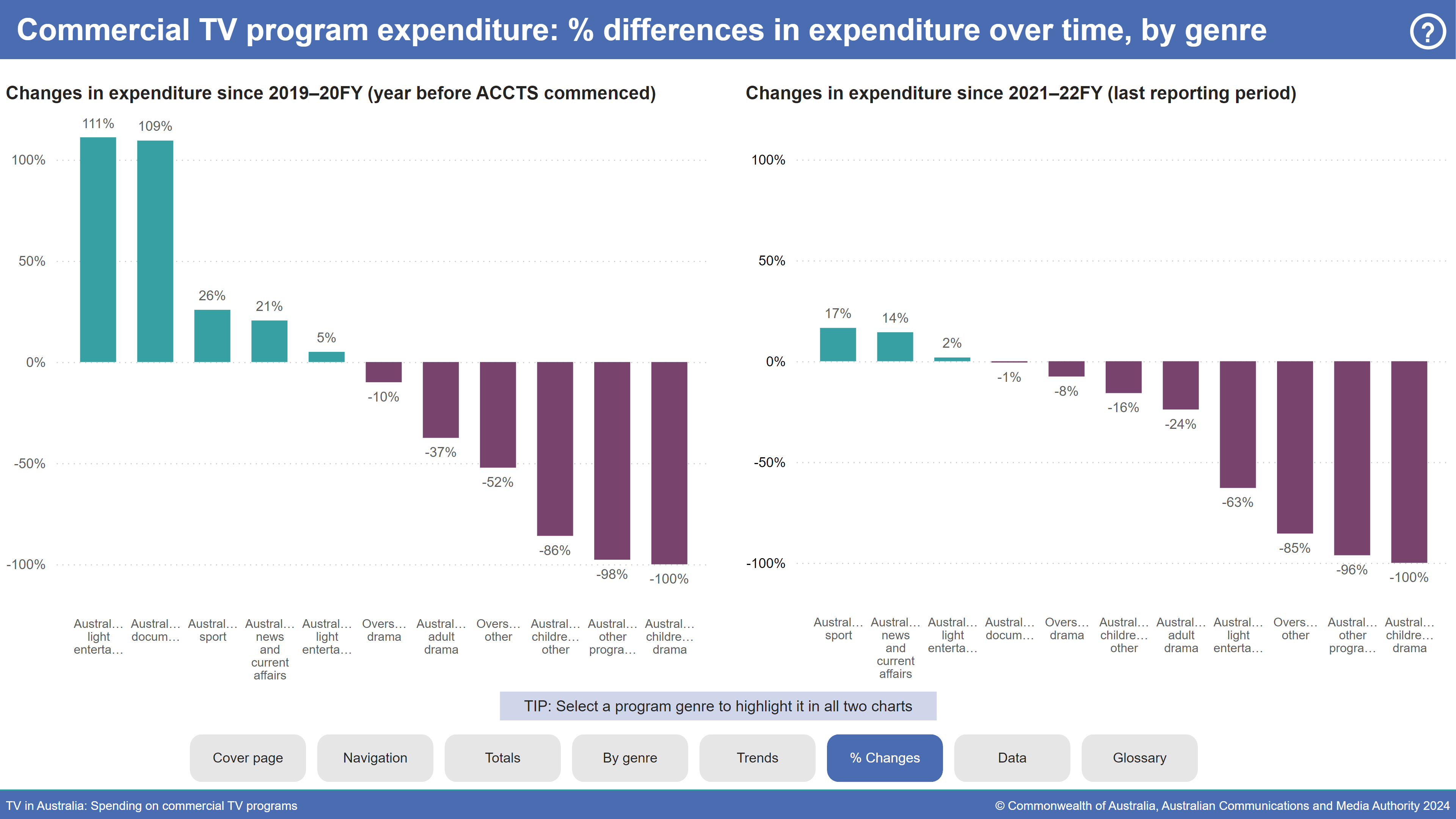 The newly published data is part of the TV in Australia: Spending on commercial TV programs report which comprises commercial TV expenditure information by genre, provided on a voluntary basis on behalf of 69 metropolitan and regional commercial TV broadcasters.