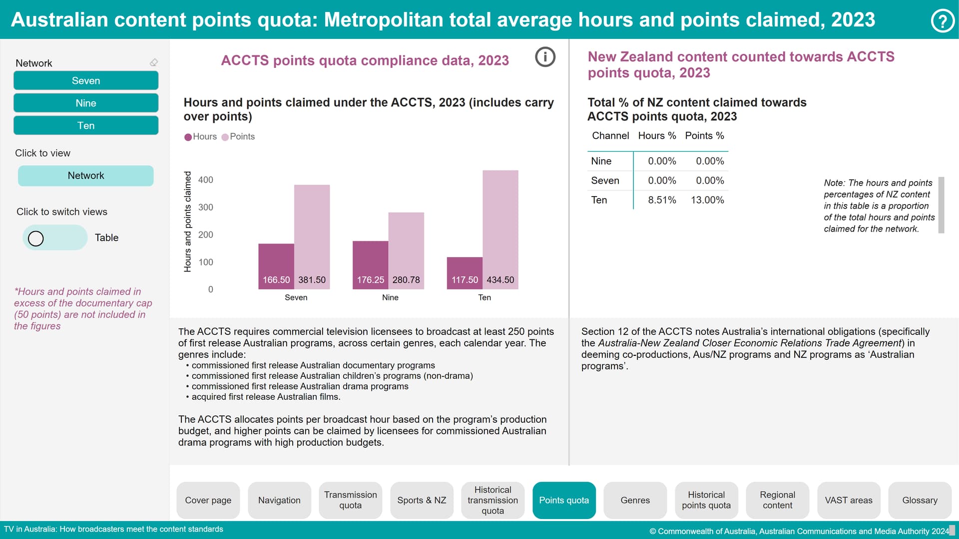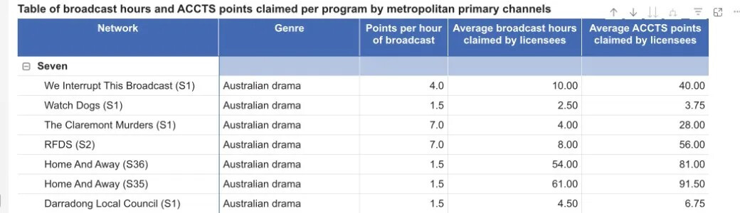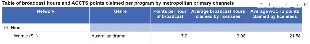 Under the Broadcasting Services (Australian Content and Children’s Television) Standards 2020 (ACCTS), commercial television licensees are required to reach 250 points by broadcasting first release Australian content across certain genres each calendar year.