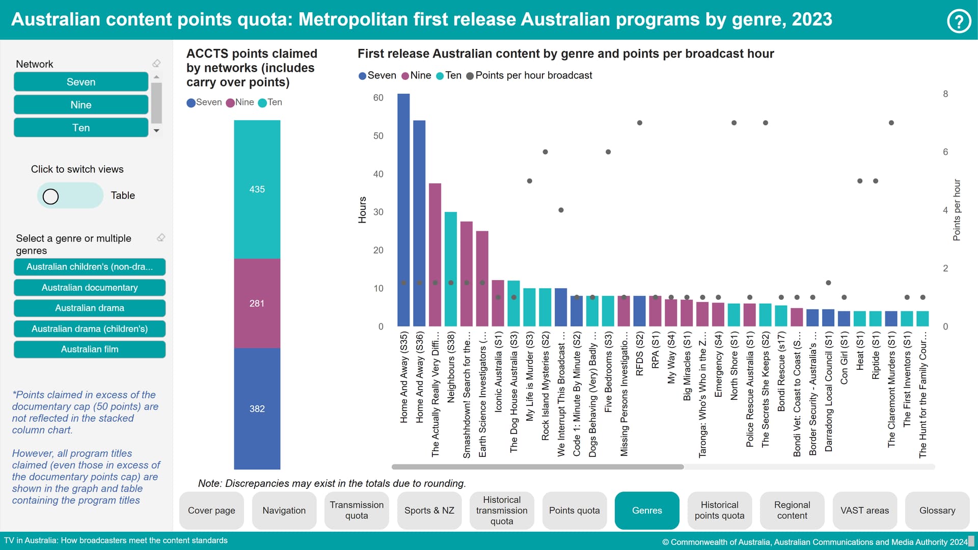 Points are allocated per broadcast hour based on a program’s genre and, for drama programs, the program’s production budget. This means that more points can be claimed per hour for commissioned Australian drama programs with high production budgets.