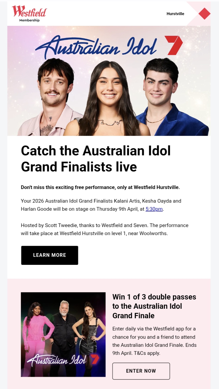 Watch the Australian Idol Grand Finalists Harlan, Kalani and Kesha as they perform live at Westfield Hurstville this Thursday, 9 April from 5.30pm. Event details here.