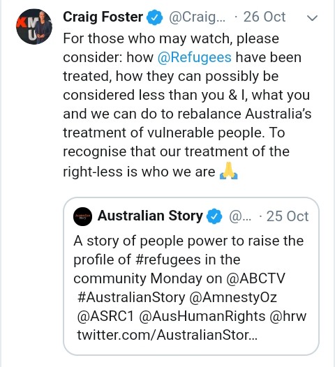 And in November last year, when a fellow football international, Bahraini refugee Hakeem Al-Araibi, was arrested in Thailand and threatened with extradition back to the country where he had been imprisoned and tortured, Craig Foster led a global campaign to free him.