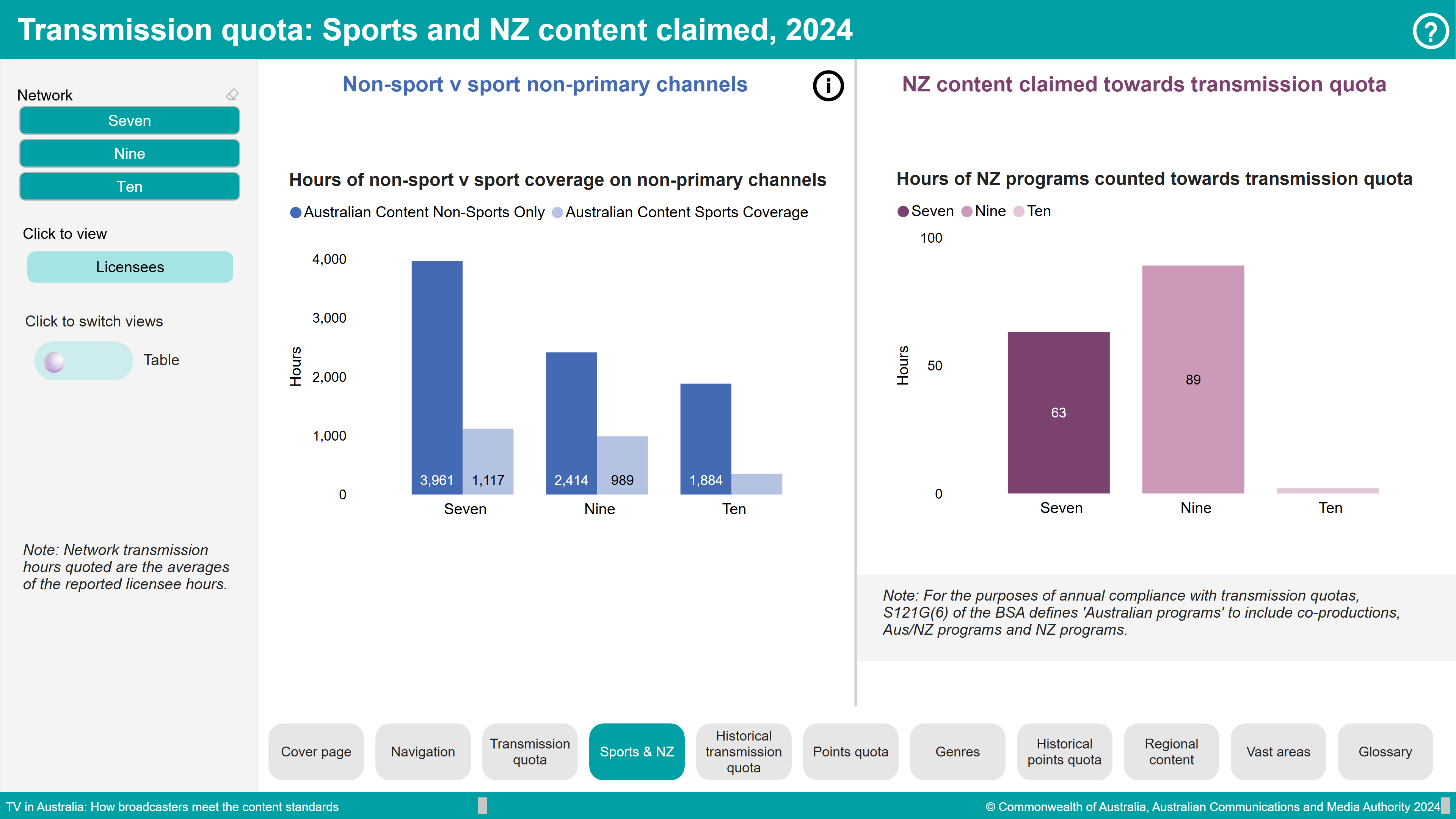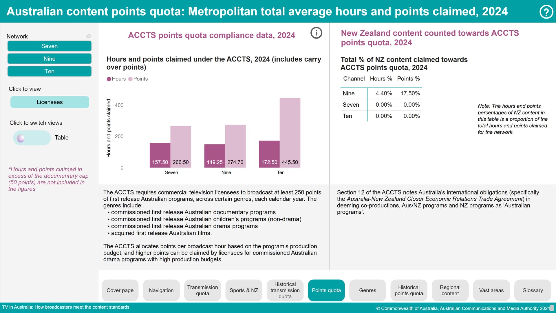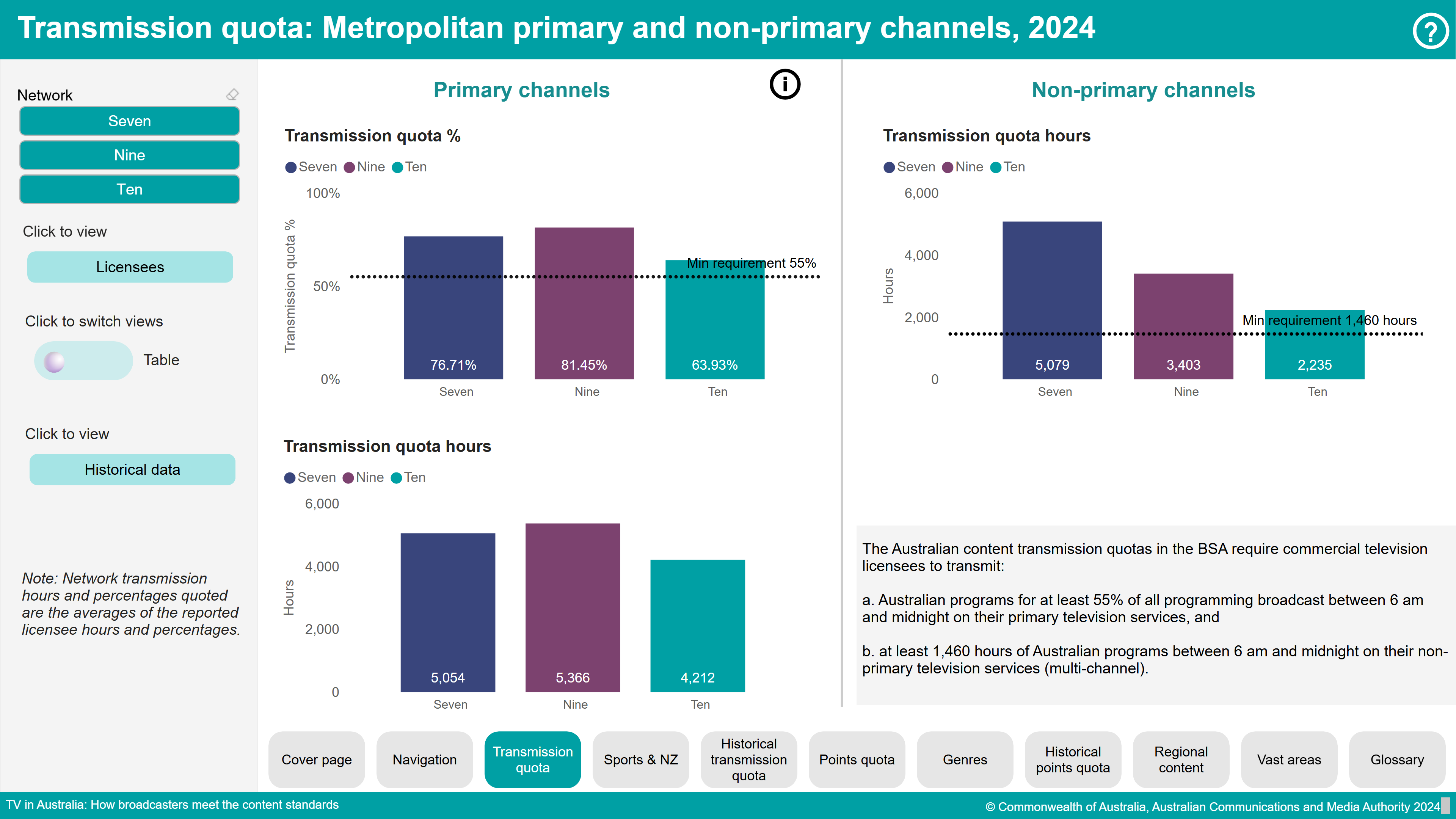The 2024 Commercial Television Compliance with Australian Content Requirements report includes results for 13 metropolitan licensees and 62 regional licensees.
