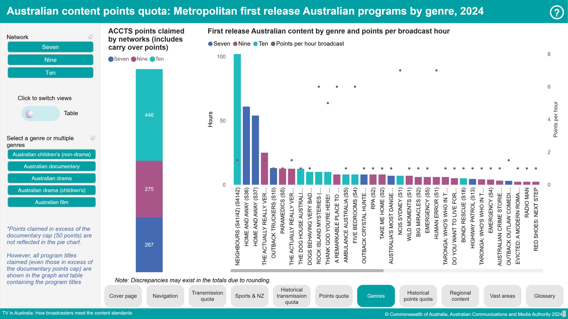 Commercial television licensees are also required to reach 250 points by broadcasting first-release Australian content across certain genres each calendar year.