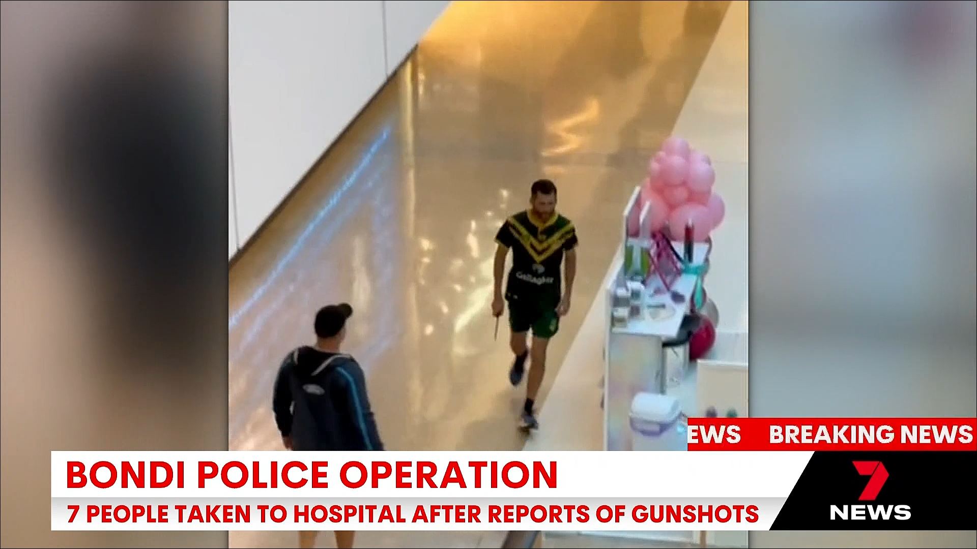 Seven just showed footage of the man running towards fleeing shoppers. He looks like he is wearing a footy jersey and footy shorts and has a knife.