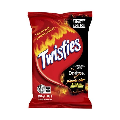 Spicy hot Twisties are back but strangely they are marketing them as a Doritos collab because they are using the same Flamin’ Hot Cheese Supreme flavour.