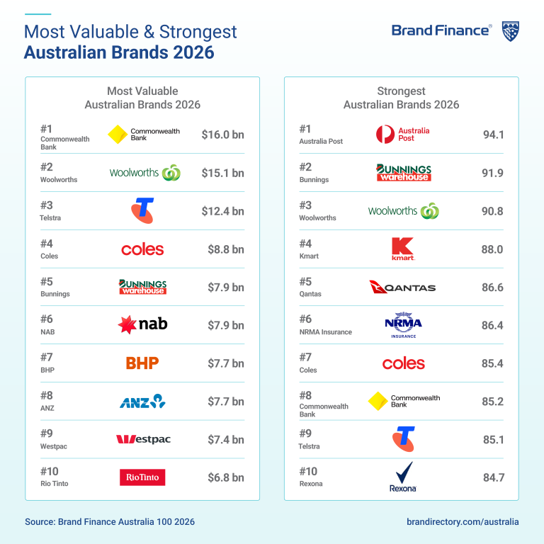 Commonwealth Bank, Woolworths, and Telstra retain the top three spots in the 2026 rankings — issued by Brand Finance, a global brand valuation consultancy — with Coles and Bunnings making up the top five.