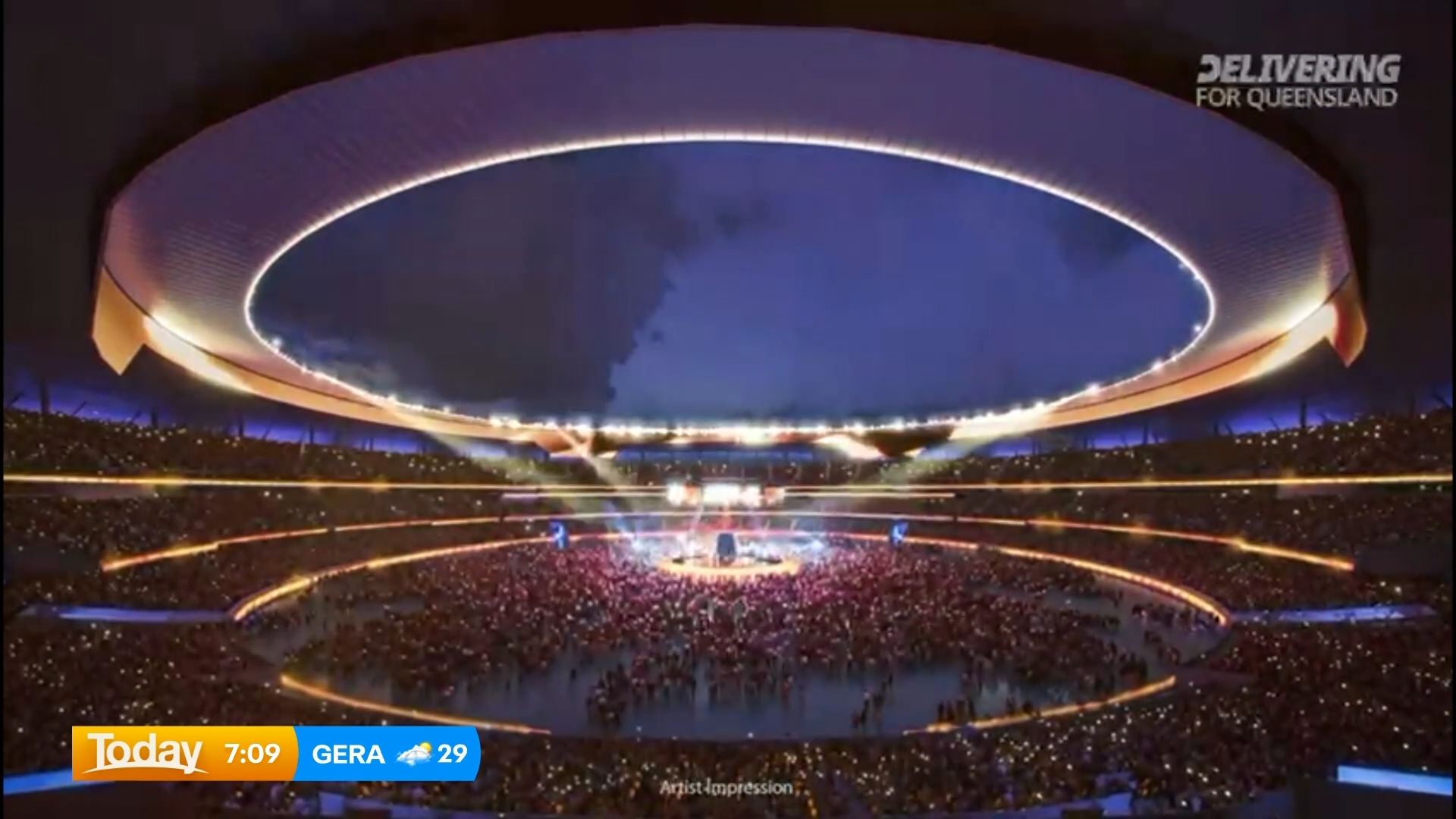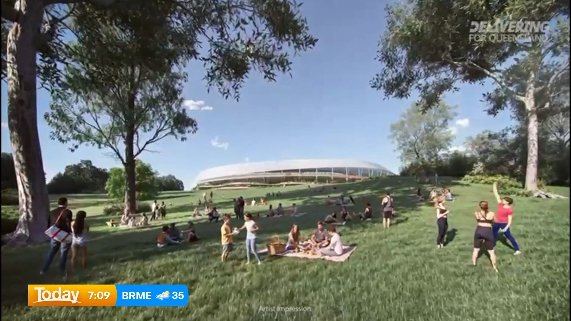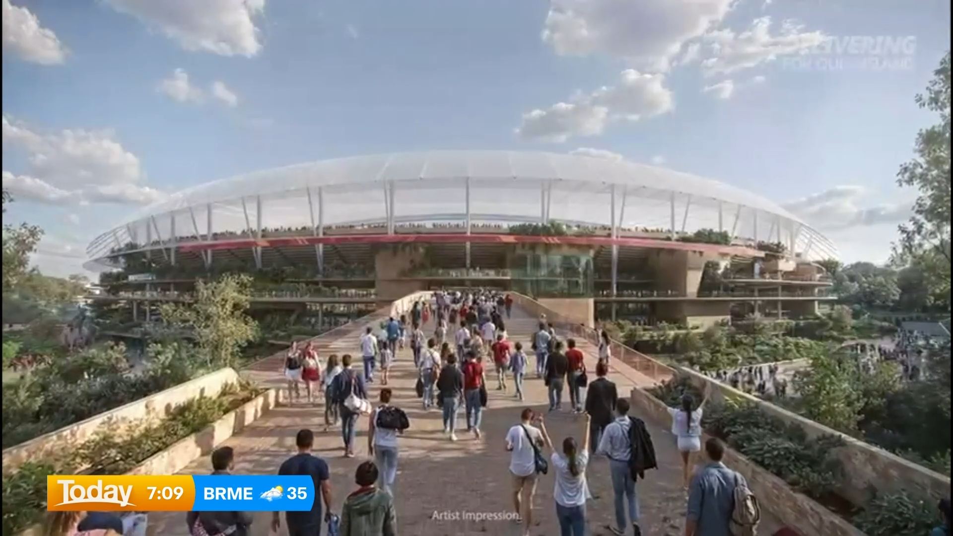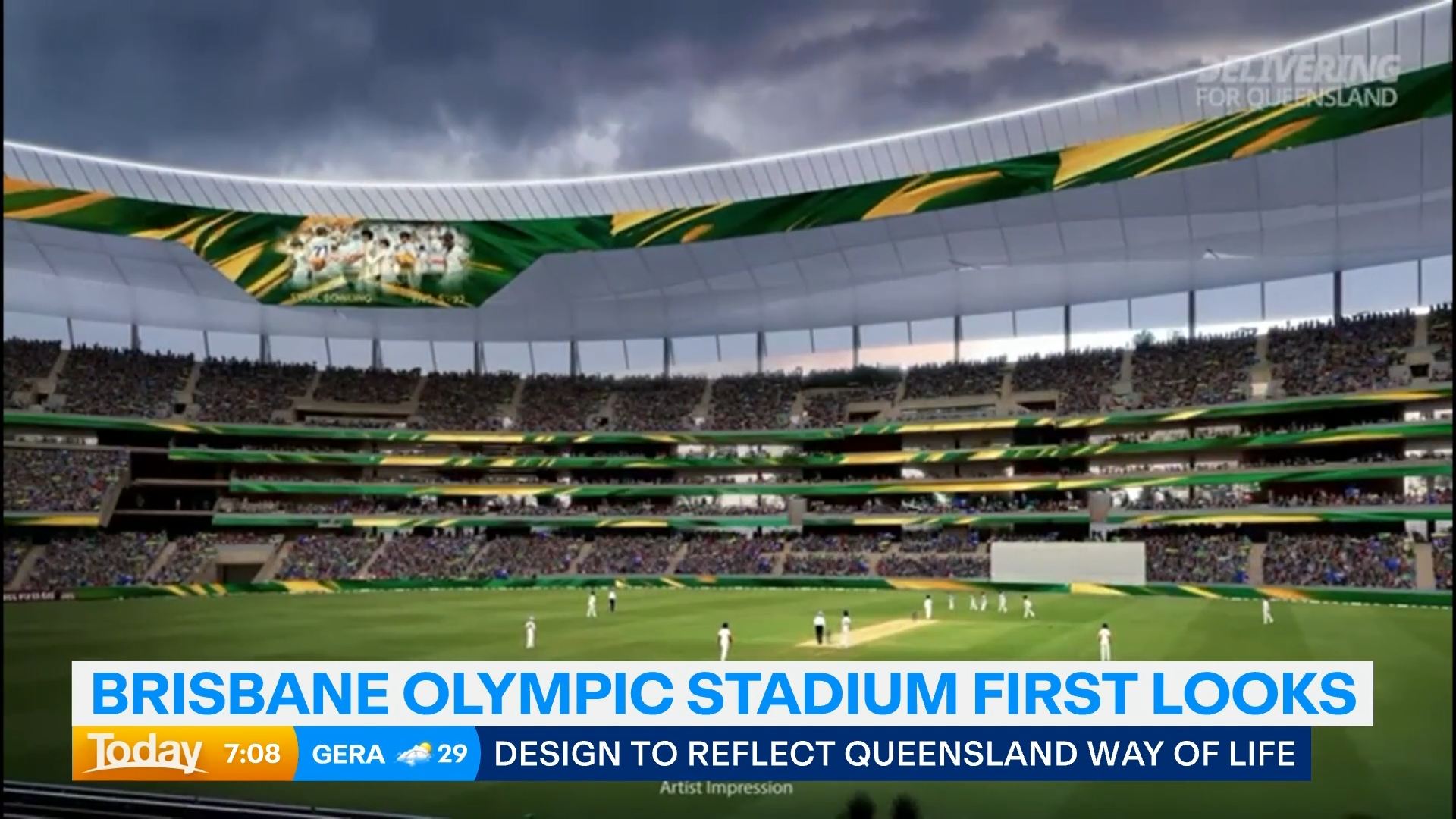 Fresh concept images reveal a lush, hillside stadium with bridges feeding spectators into multiple levels, picnic-friendly live sites in its shadow and a roof inspired by the wide verandas of classic Queensland homes.