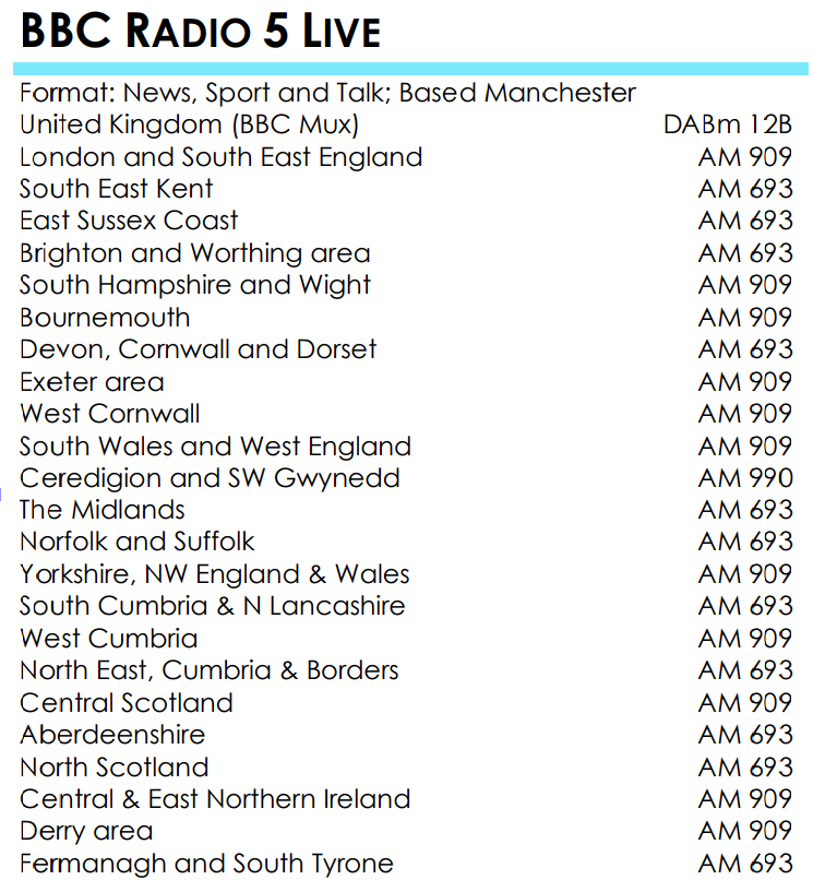 On the point about AM, are you sure you weren’t sometimes in areas where 909 isn’t the best signal for BBC Radio 5 Live. In some areas, 693 is best (or 990 in parts of West & North West Wales)