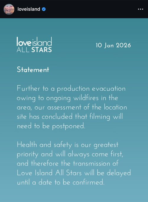 The upcoming Love Island All Stars from South Africa has been postponed due to bushfires in the area. The villa had to be evacuated with pre-production unable to proceed. Producers had hoped to go to air Monday but obviously not.
