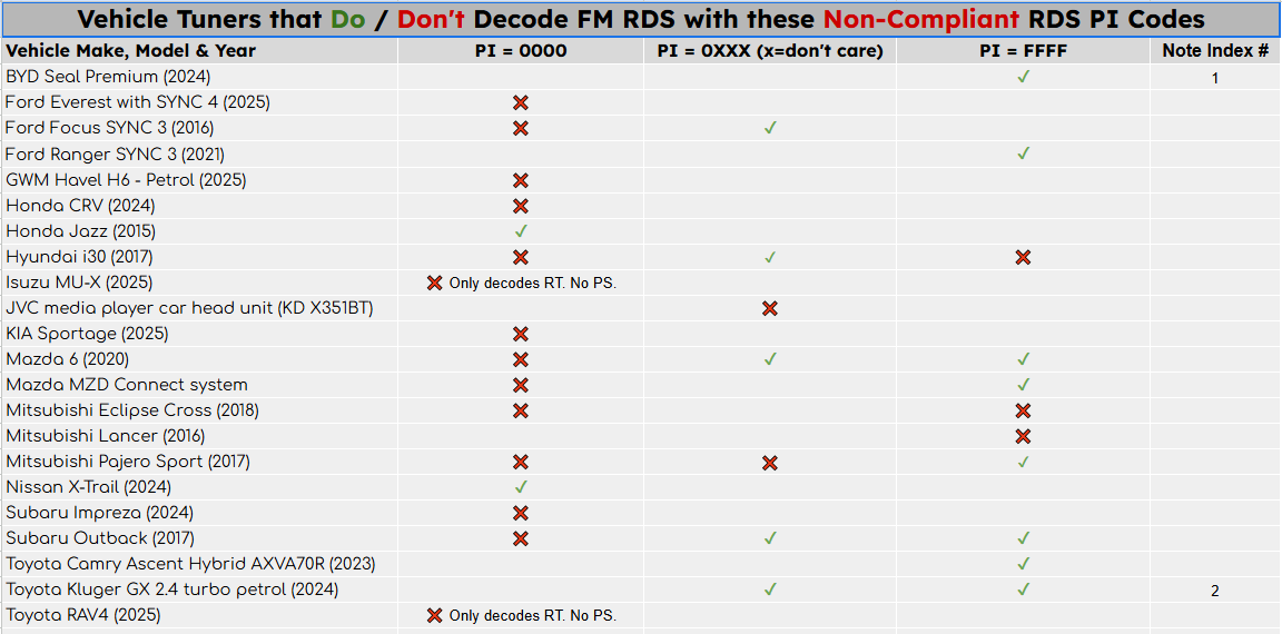 I’d also be interested to know if any of the very recently manufactured (last 5 years) Mitsubishi vehicles can decode RDS for these stations.