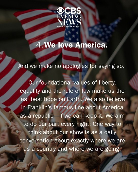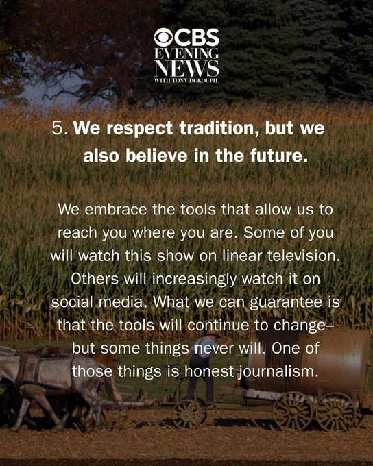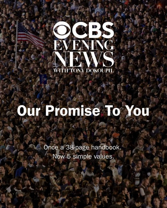 When the new CBS Evening News kicks off on Monday, we promise to live by these five simple principles – from our very first show on the road, to our first broadcast on the new set in New York, and every one after that.