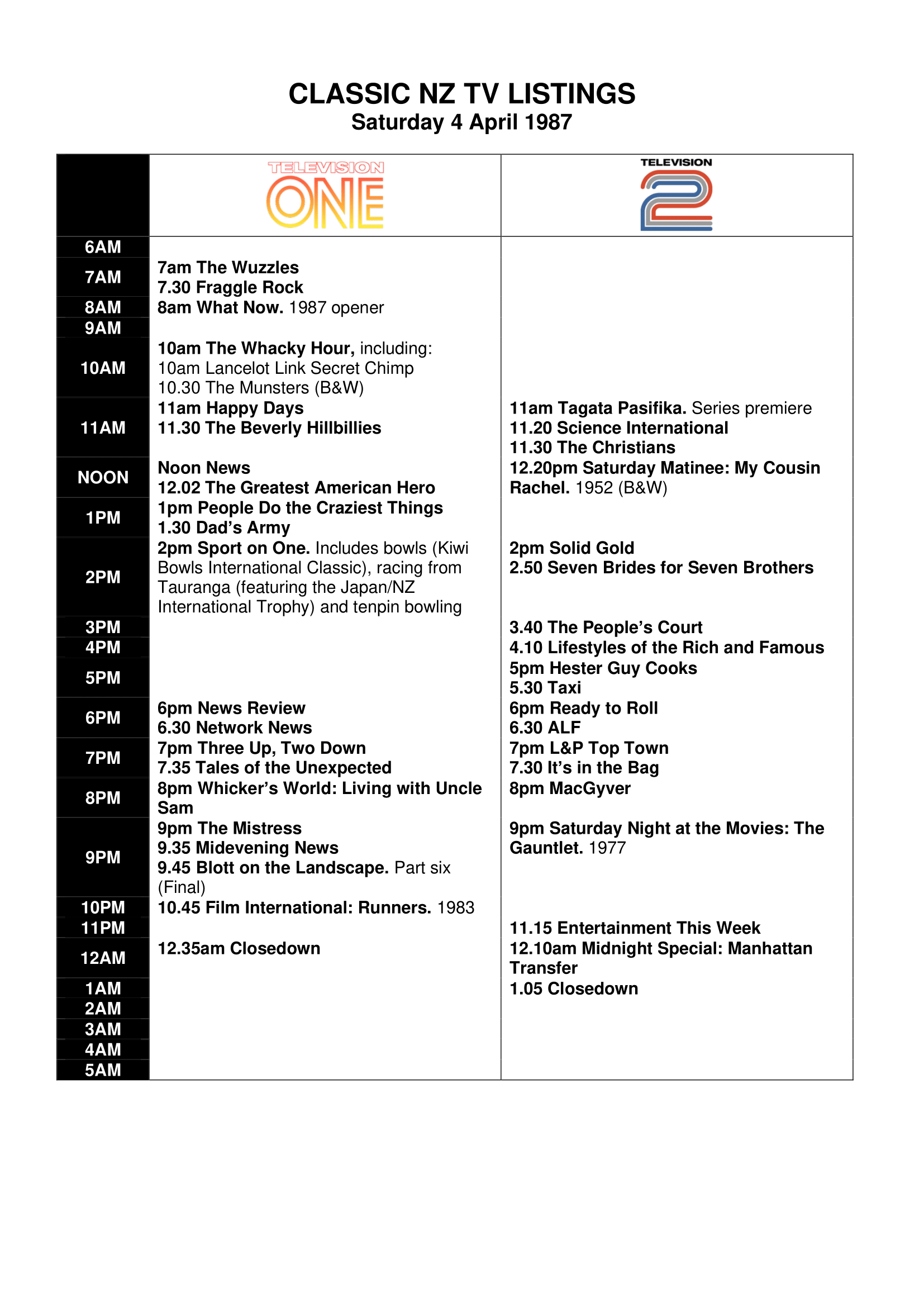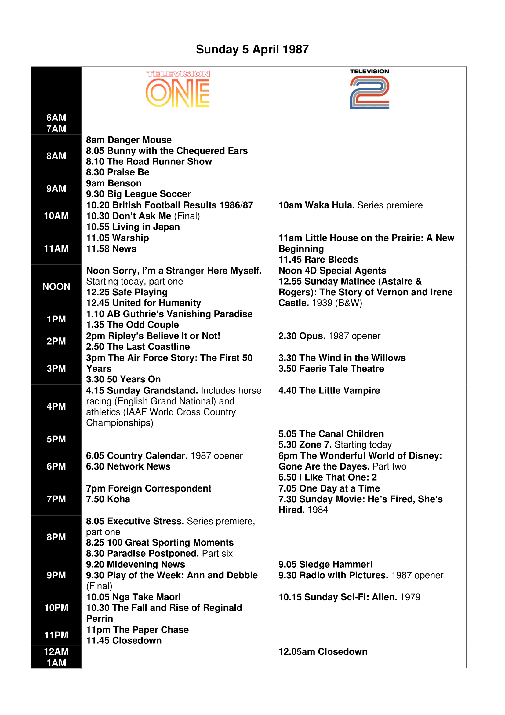 Includes rugby (Super 12 - Otago Highlanders v Wellington Hurricanes), motorcycling (World Superbikes), boxing (World Championship Boxing - Prince Naseem Hamed v Wilfredo Vasquez) and yachting (Whitbread Round the World race - leg seven)