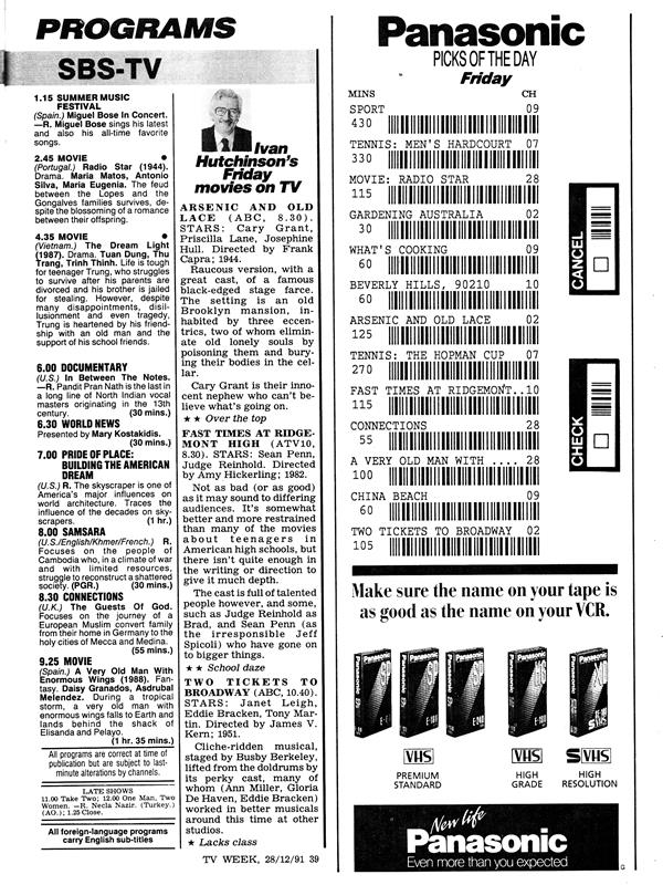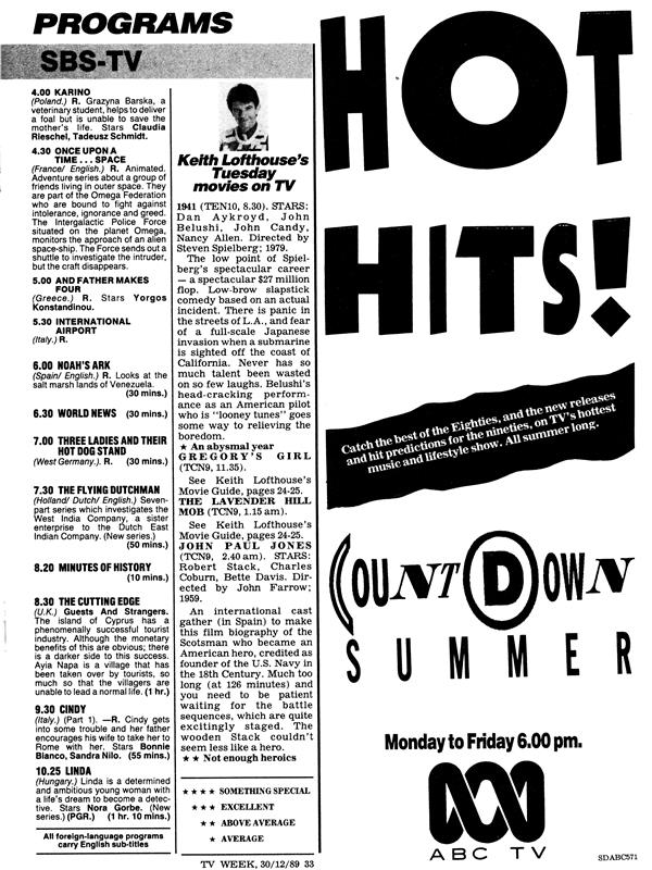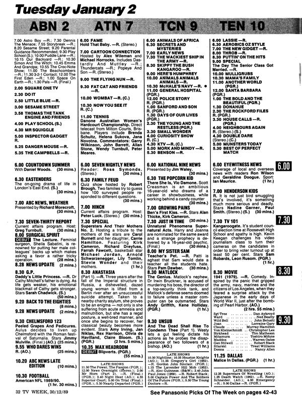 Also, from the following Monday, 6 January, the big soap battle between Home And Away and Neighbours began with both shows returning for the new year up against each other at 7.00 for the first time (in eastern states, anyway). By March, Neighbours retreated from the battle and moved to 6.30.