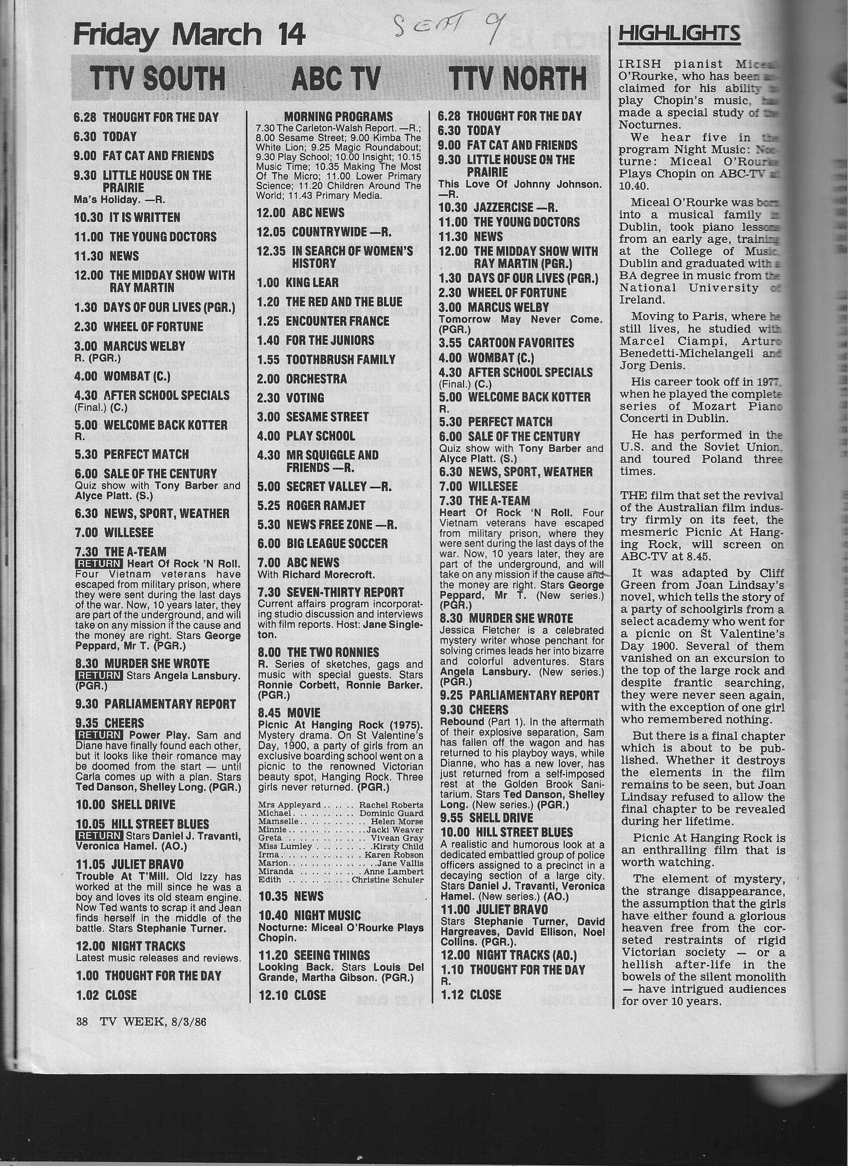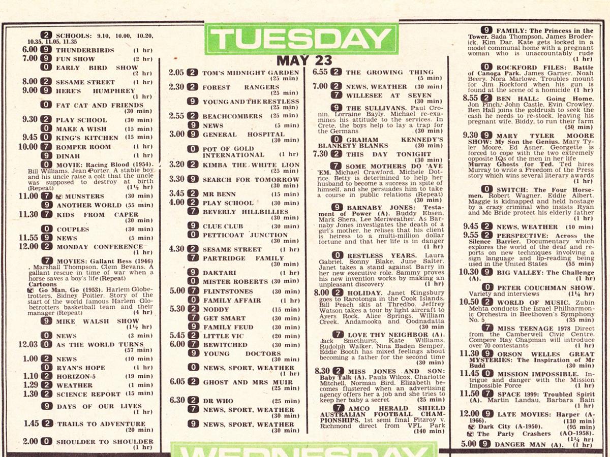 it’s a very Nine-heavy line-up but there are a few token items from elsewhere, e.g. The Restless Years, Simon Townsend’s Wonder World and the US series Flamingo Road from Ten, and Shirl’s Neighbourhood from Seven. Incidentally those episodes of The Restless Years must have been quite old as the show was axed by Ten 18 months earlier!