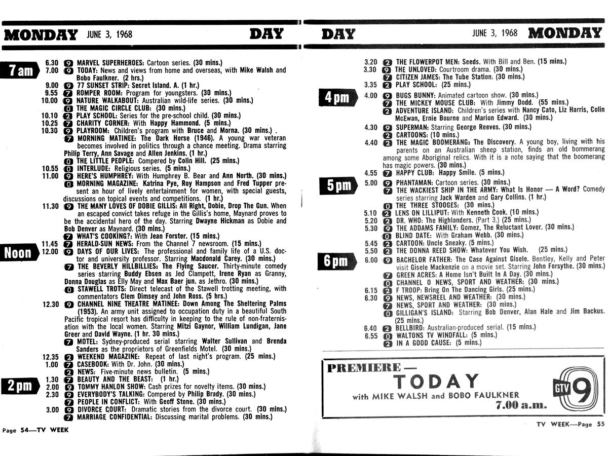 - Evening soaps from overseas include Peyton Place and Coronation Street on Nine, and local drama with the relatively new Bellbird on ABC.