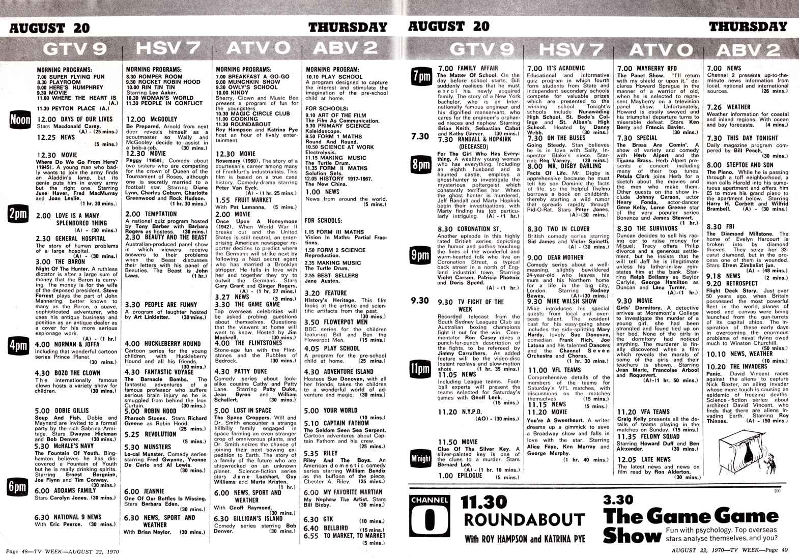 Sydney TV: Wednesday 20 August 1969