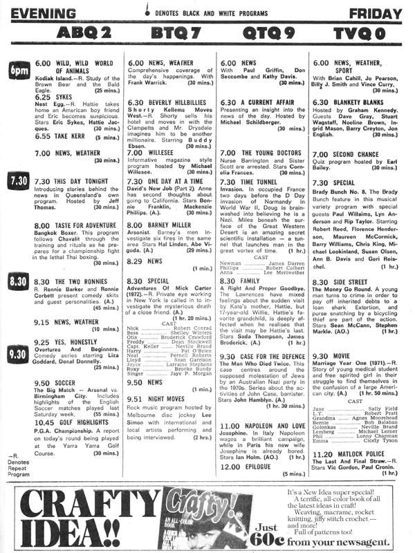 Curiously, TV Week lists an British series The Hello Girls (ABC) as a highlight even though it’s “Coming Soon”. I know they used to do that sort of thing because sometimes state-based schedules varied even though the highlights pages were national, but I can’t imagine ABC having too many local variations on this occasion! Strange that TV Week could not have found something else to fill that section.