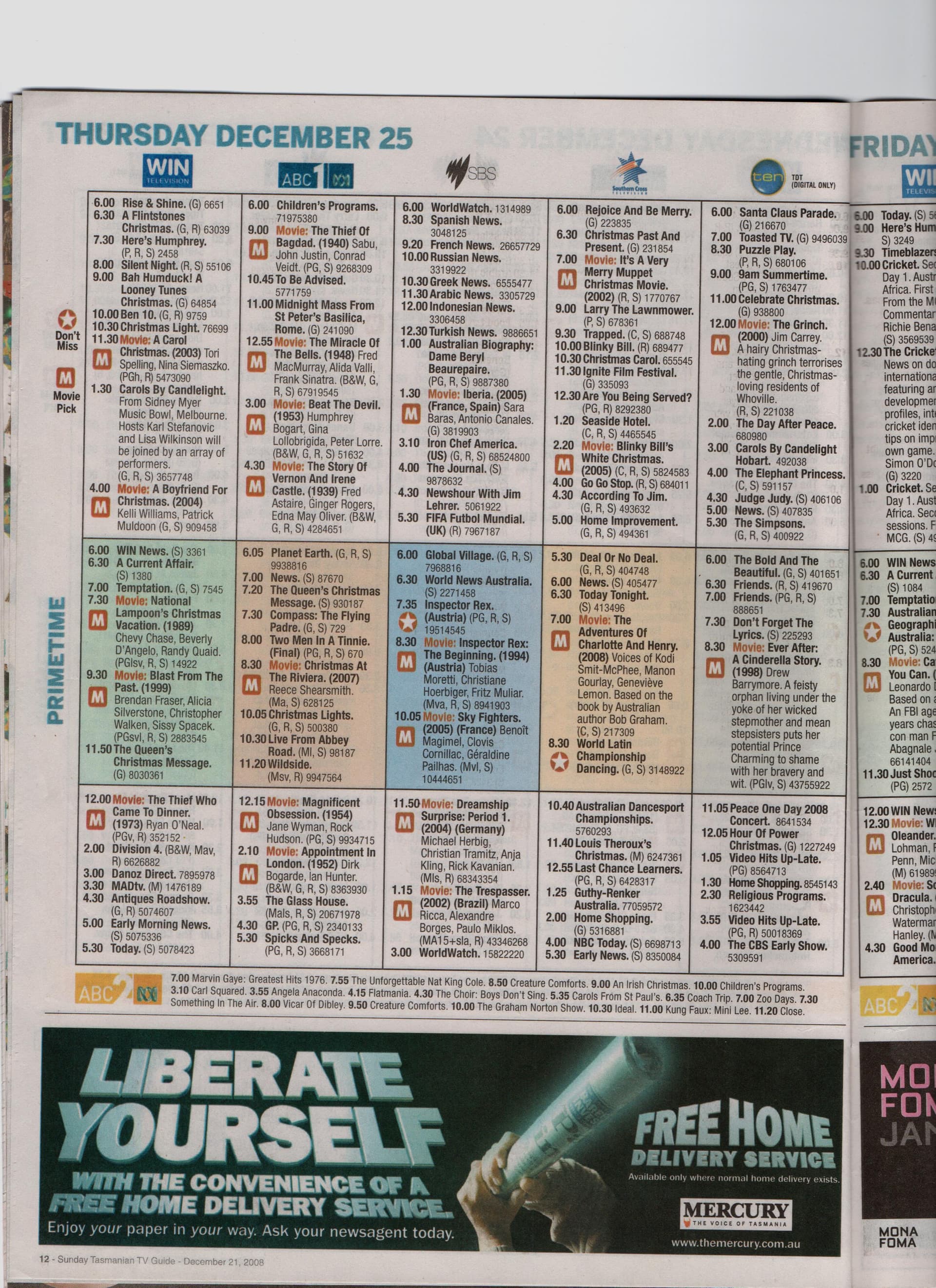 Over at Channel 9, they didn’t broadcast the Nine Morning News, instead they broadcasted Movies. However, they still showed the Afternoon News. Not to mention that The Christmas Orange aired in its 4pm timeslot. Carols by Candlelight aired at 7PM on WIN, while Nine aired at 8:30PM. I believed that this was Ray Martin’s final year as Carols by Candlelight host.