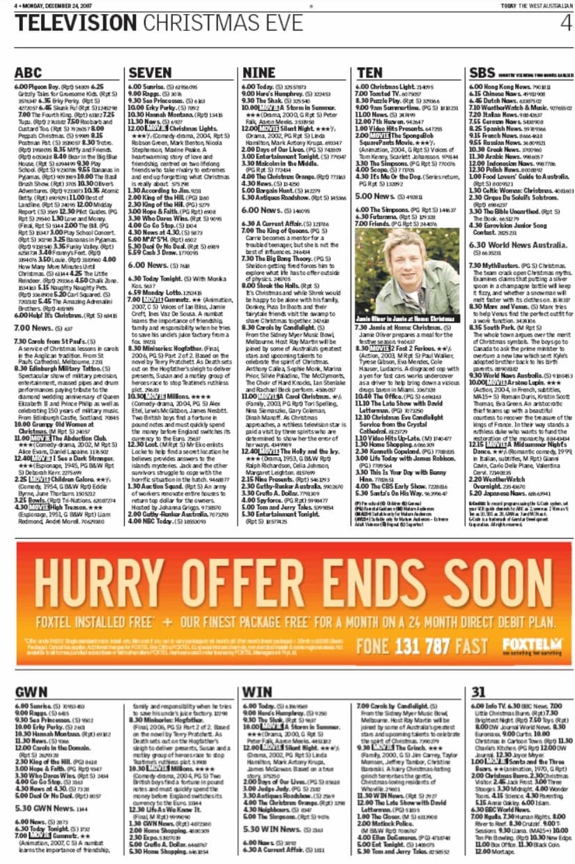 Over on Channel 10, They didn’t air Early News instead they broadcasted the Christmas Light. I even noticed that The Simpsons aired at 3;30PM on TEN! THe Bold and the Beautiful didn’t air at 4:30pm and was replaced by It’s Me or the Dog.