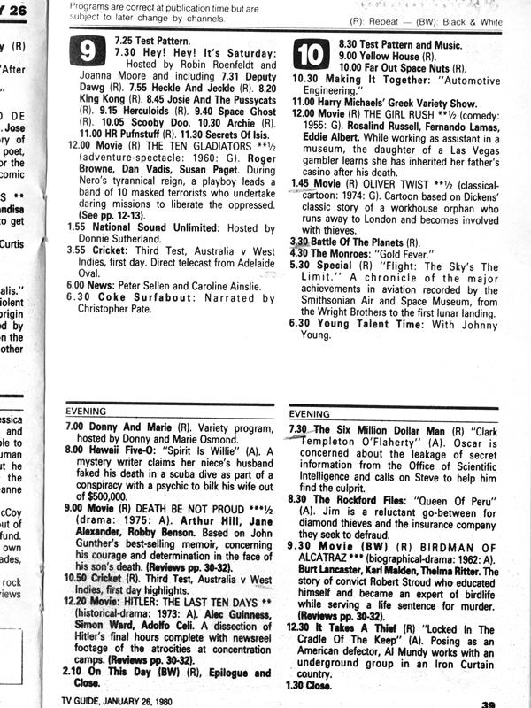 Similarities with Melbourne on that day on commercial stations: Golden Girls and Kate & Allie on Seven, MTV on Nine, and Best of Young Talent Time and Magnum PI on Ten.