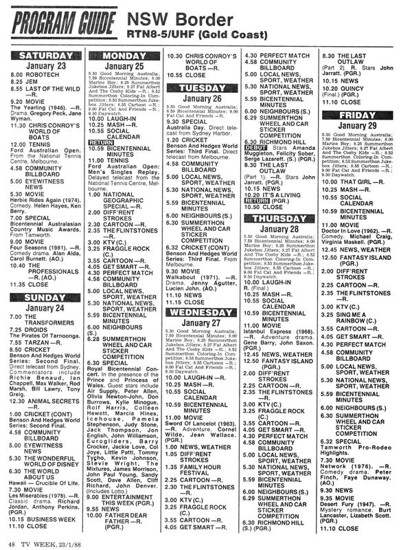 Sport dominated the day: On Nine the Bicentennial Test Match between Australia and England continued at the SCG, with a golf tournament (the Palm Meadows Cup) during the lunch break. ABC had highlights of its coverage of the same cricket match in the late evening, this was shown live on ABC regional stations. Ten had horse racing live from Flemington, while ABC had Sports Arena, a sports magazine show hosted by Peter Gee.